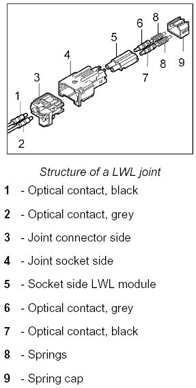 The LWL is delivered with affixed plastic contacts. These contacts are latched in the connector housing in the case of repairs. Grey and black contacts with identical mechanical dimensions are used.