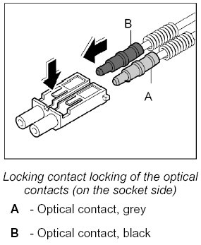 The LWL and the plug connections must not come into contact with fluids such as water, creeping compound, preservative, anti-freeze protection, cleaning agent. They will impair the MOST system function or cause complete system failure. Even plug connectors with plugged-in protective caps must not come into contact with the fluids listed.