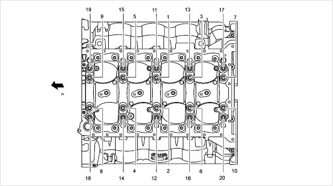 1 through 20 - Tightening sequence for M11 and M10 screws - Observe different torques!
