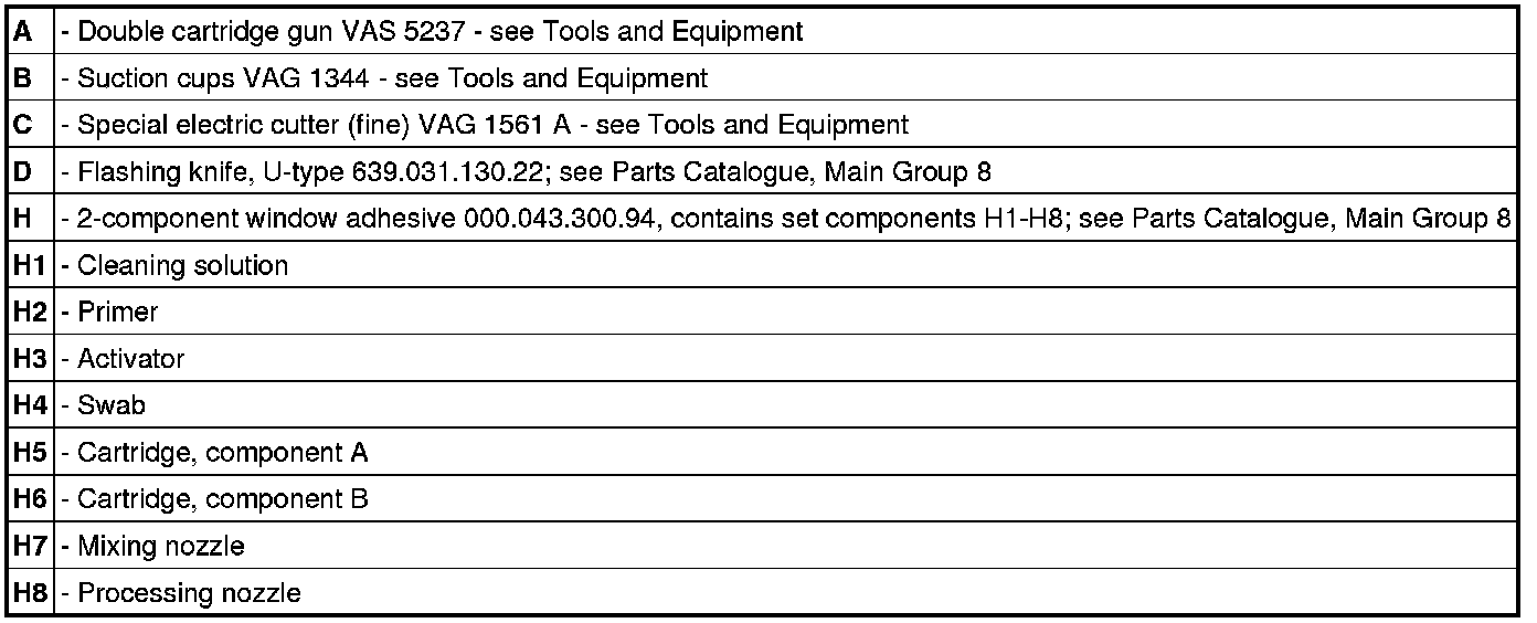 The following tools and materials are required for removing and installing the windscreen with 2-component adhesive: