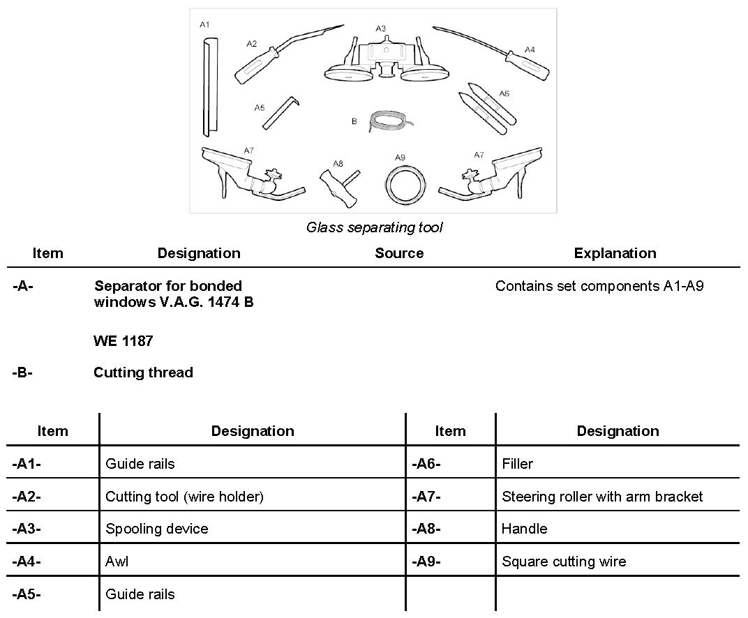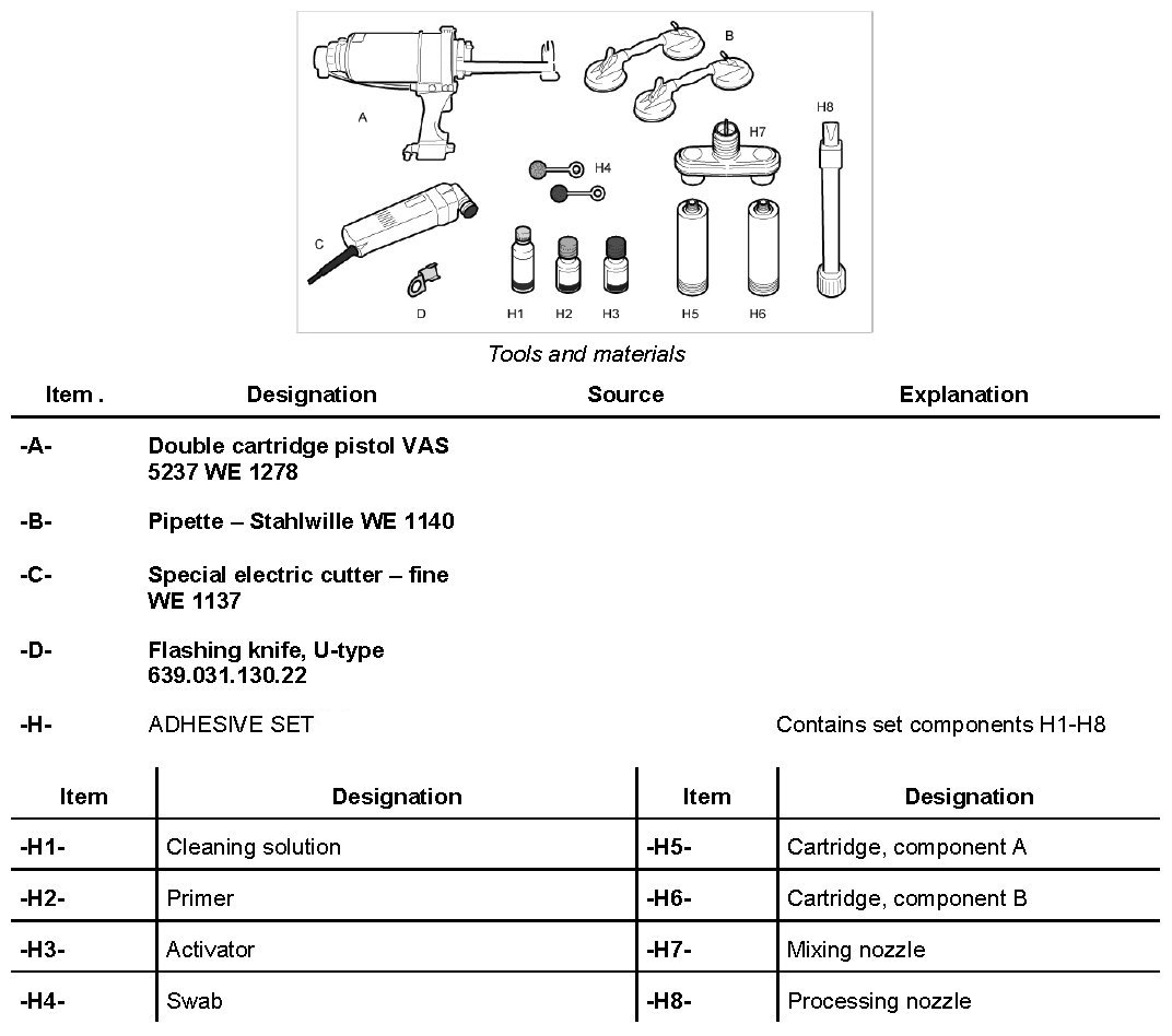 The following tools and materials are required for removing and installing the windscreen with 2-component adhesive: