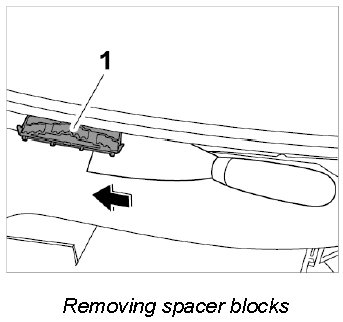 1. Insert a spatula under the spacer blocks -1- and remove the expanding rivets. Spacer blocks -1- must be replaced.