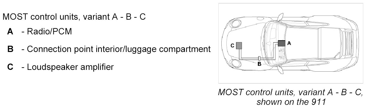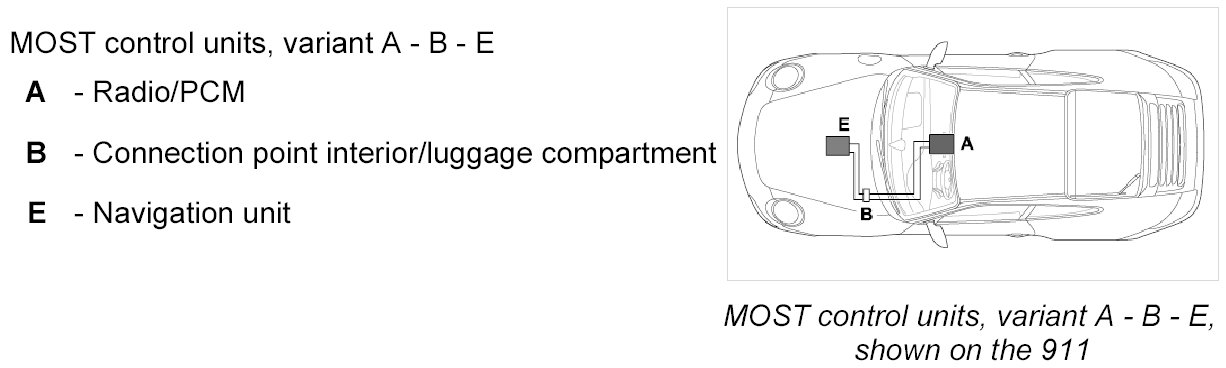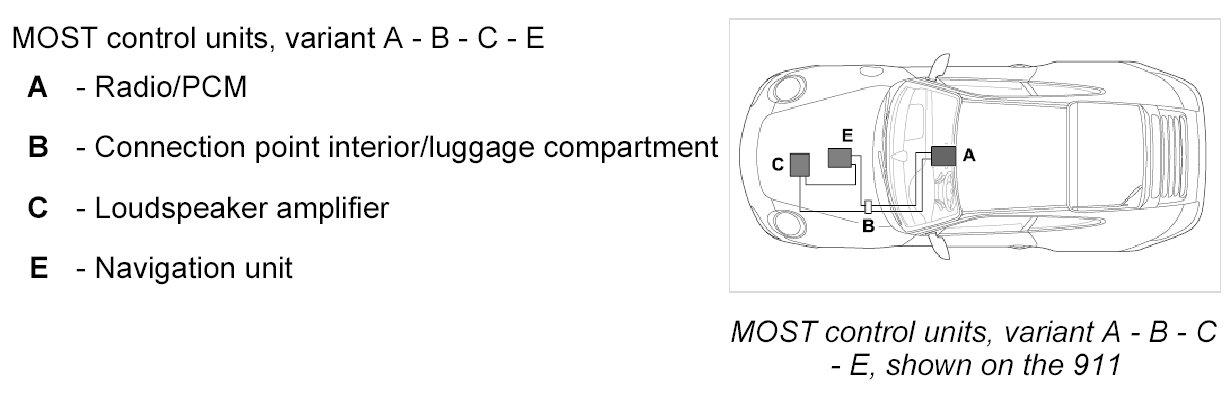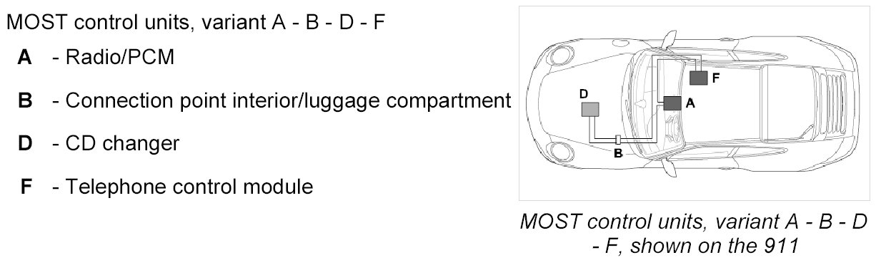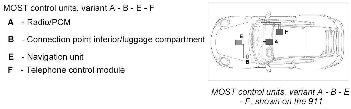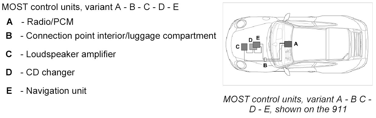 The graphic clarifies the cabling of the individual MOST control units which vary according to their equipment.