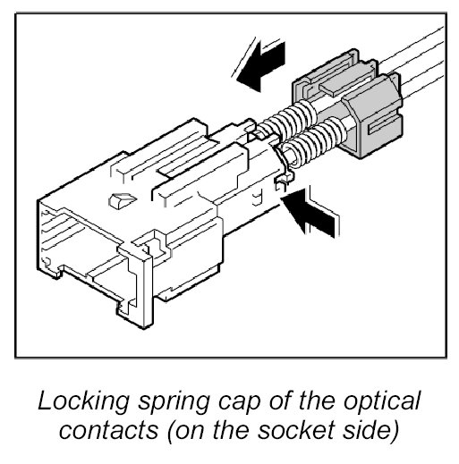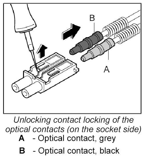 The LWL is delivered with affixed plastic contacts. These contacts are latched in the connector housing in the case of repairs. Grey and black contacts with identical mechanical dimensions are used.