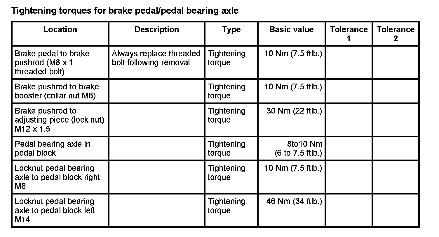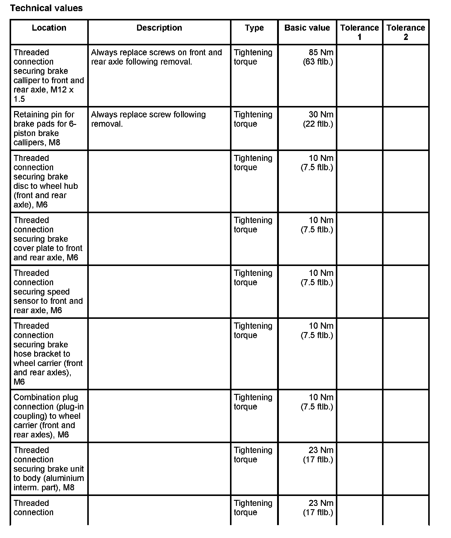 Tightening torques for mechanical brake