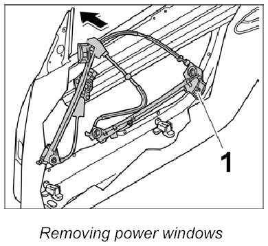 4. Fold power windows -1- together and remove through the door opening -arrow-.