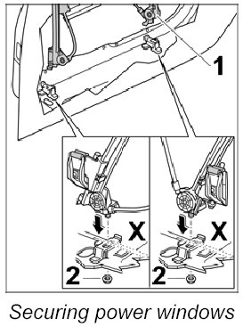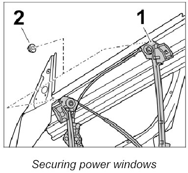 3. Unscrew fastening nuts -2- on power windows -1-.