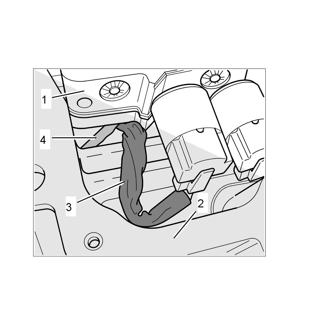 The wire harness for the solenoid valves -3- and the cable for the temperature sensor -4- must be routed in the recess between the transmission housing -2- and electrohydraulic control unit -1- because otherwise the cables can become squashed, resulting in damage and malfunctions.