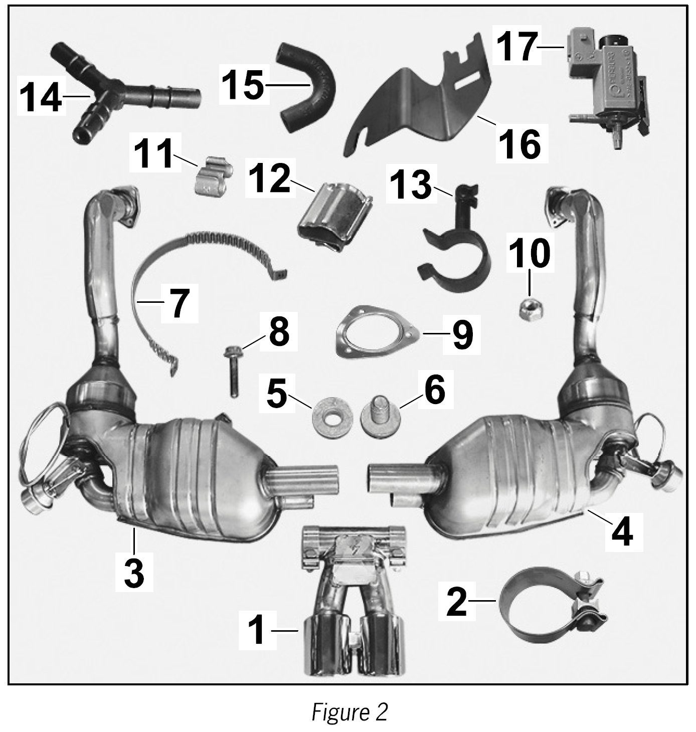 - Right main muffler (for cylinder bank 1 3): Porsche logo; code 987/36 and Part No.: 987.113.512.30 -> Figure 3.