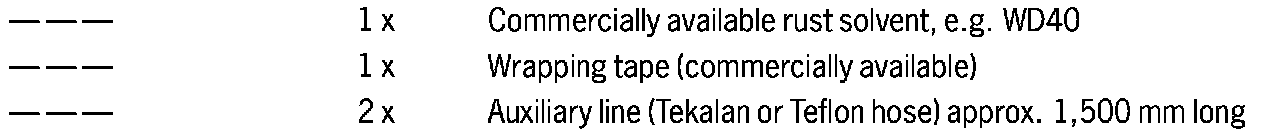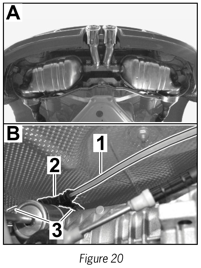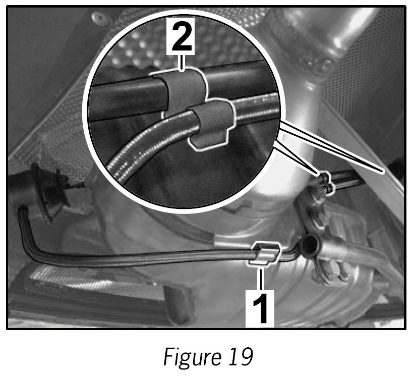 Clip in hose clip (2 ea. -> Figure 2, item 11) on the main muffler strut, with the opening for the steelen cased line facing backwards ( ->Figure 19 -2-).