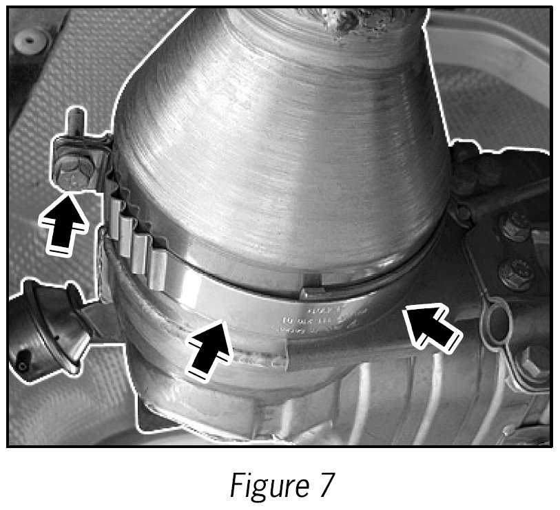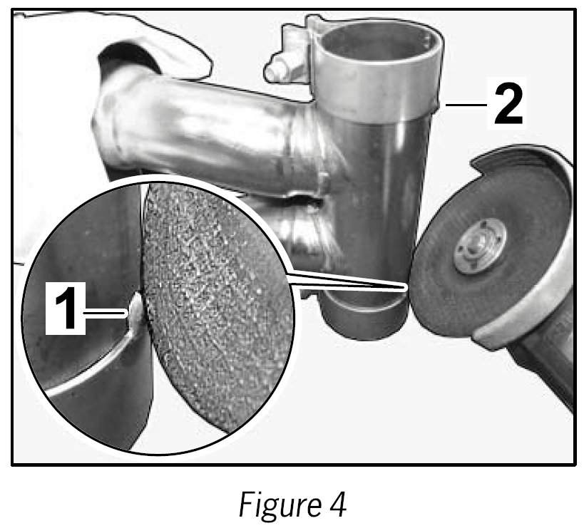 1. 5. 3 Carefully remove spotweld on the clamp (2 ea. -> Figure 4 -1 & 2-) on the sports tailpipe using a chisel or parting grinder.