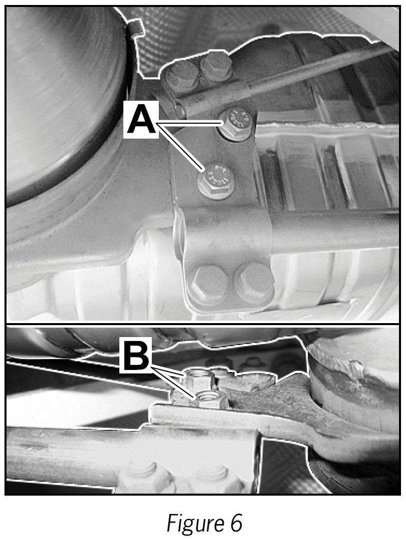 2.6 Secure the two main mufflers on the main silencer holder with four new M8 x 16 hexagon-head bolts (-> Figure 6 -A-) and four new M8 hexagon nuts (-> Figure 6 -B-).