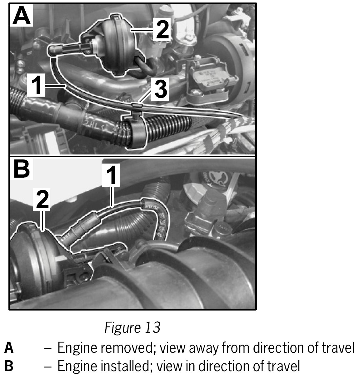 4. 2. 1 Depending on engine and transmission type, unclip vacuum line (Tekalan 4 x 1 x X; black -> Figure 13 -1-) close to the vacuum unit ahead of the intake distributor (-> Figure 13 -2-) in direction of travel out of the line clip (-> Figure 13 -3-) if necessary.