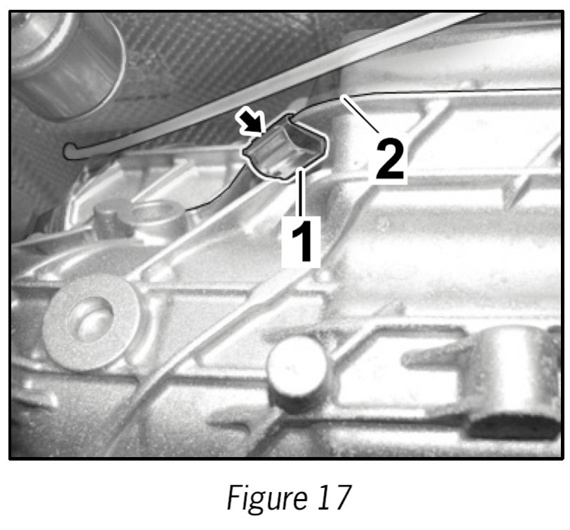 Clip hose clip (-> Figure 2 -12- or -> Figure 17 -1- onto a cooling fin (-> Figure 17 -2-) on the transmission.