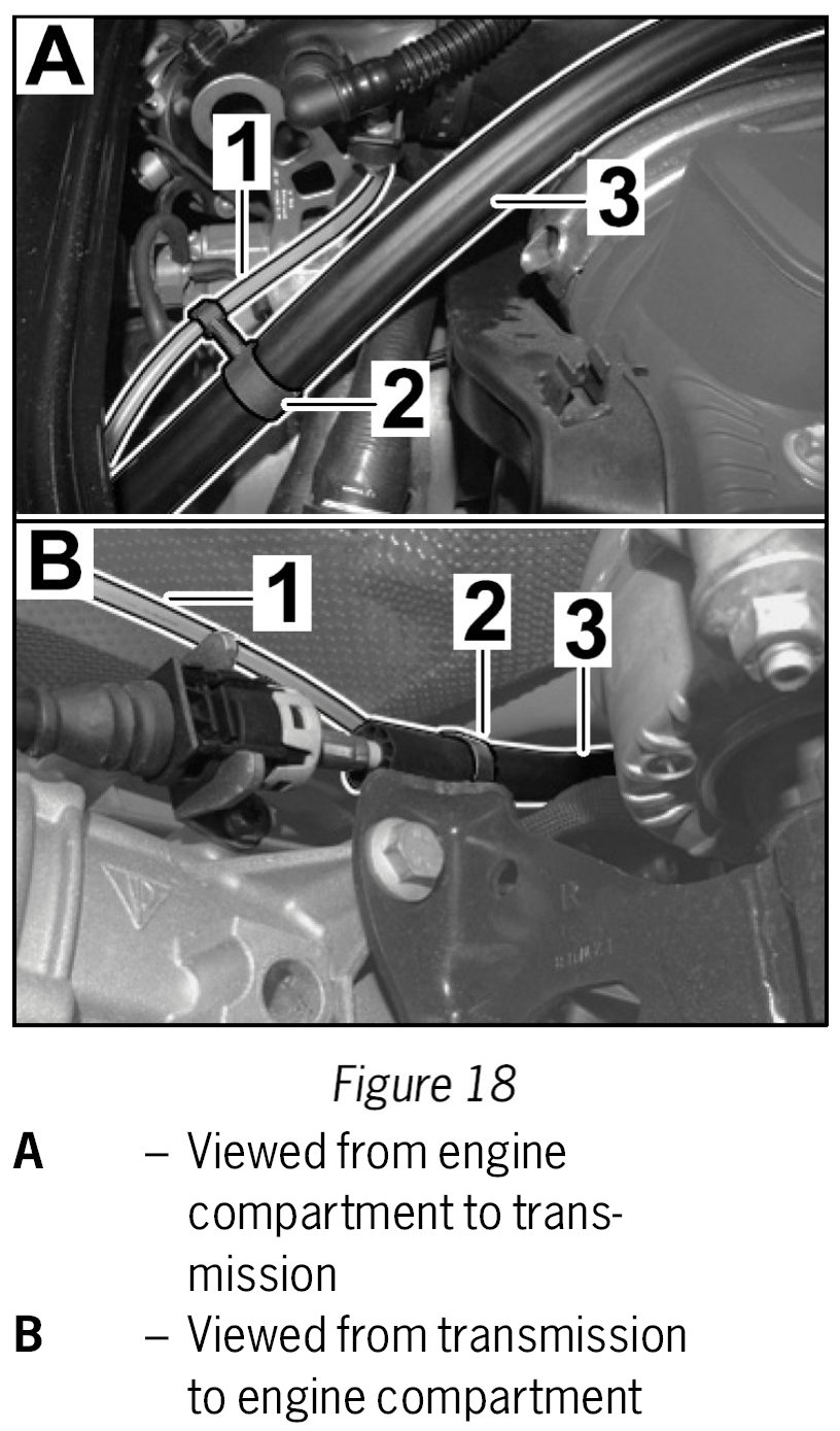 4. 3. 3 Secure the Tekalan hose (5 x 1 x 1100; transparent) -> Figure 18 -1- in the middle with at least one hose clip (left: dia. 4-5 mm/right: dia. 19-24 mm; -> Figure 18 -2-) on the transmission shift cable (-> Figure 18 -3-).