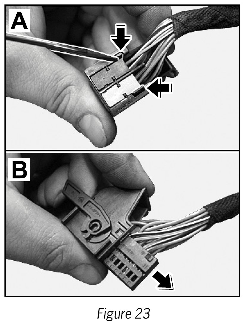 5. 2. 4 Release secondary lock on connector housing D -> Figure 23 -A, arrows- and pull both connectors out of the housing -> Figure 23 -B, arrow-.