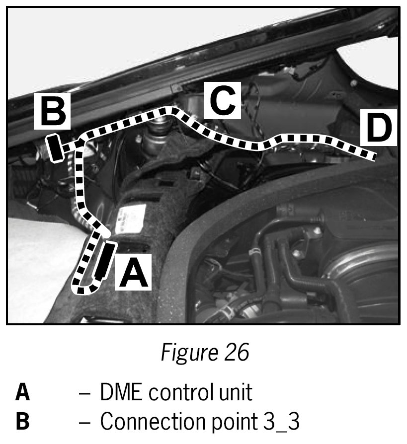 5. 4. 1 Rear/B-pillar area: DME control unit (ONLY for Cayman, -> Figure 26 -A-) and connection point 3_3 (ONLY for Cayman S,-> Figure 26 -B-)-> along wire harness at the side of the vehicle->left C-pillar (-> Figure 26 -C-)-> B-pillar (-> Figure 26 -D-)-> cable bushing at B-pillar.