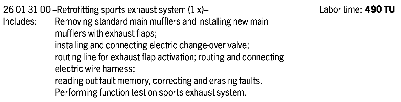 Engine power and exhaust behaviour of the vehicle are not affected. The sports exhaust system is also available as a factory installed option for new vehicles by requesting optional equipment "XLF ."