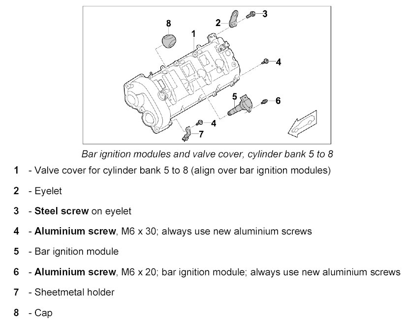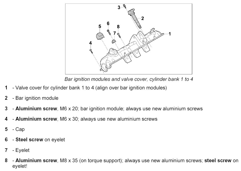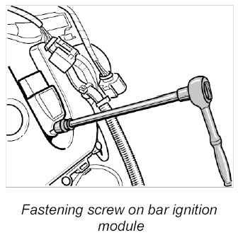 - The aluminium screws on the bar ignition modules are difficult to reach close to cylinders 4 and 8. Shorten the tool you are using as required.