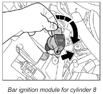 3.3. Remove the bar ignition module for cylinder 8 by turning it past the B+ line.