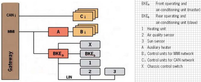 When it comes to exchanging data with other control units, the air-conditioning system is fully integrated into the various networks and bus technologies (CAN/LIN). The front control panel is connected directly to the MMI and is used as the master for air conditioning. The master obtains its information (e.g. from the rear operating and air-conditioning unit [Slave]) via the LIN bus.