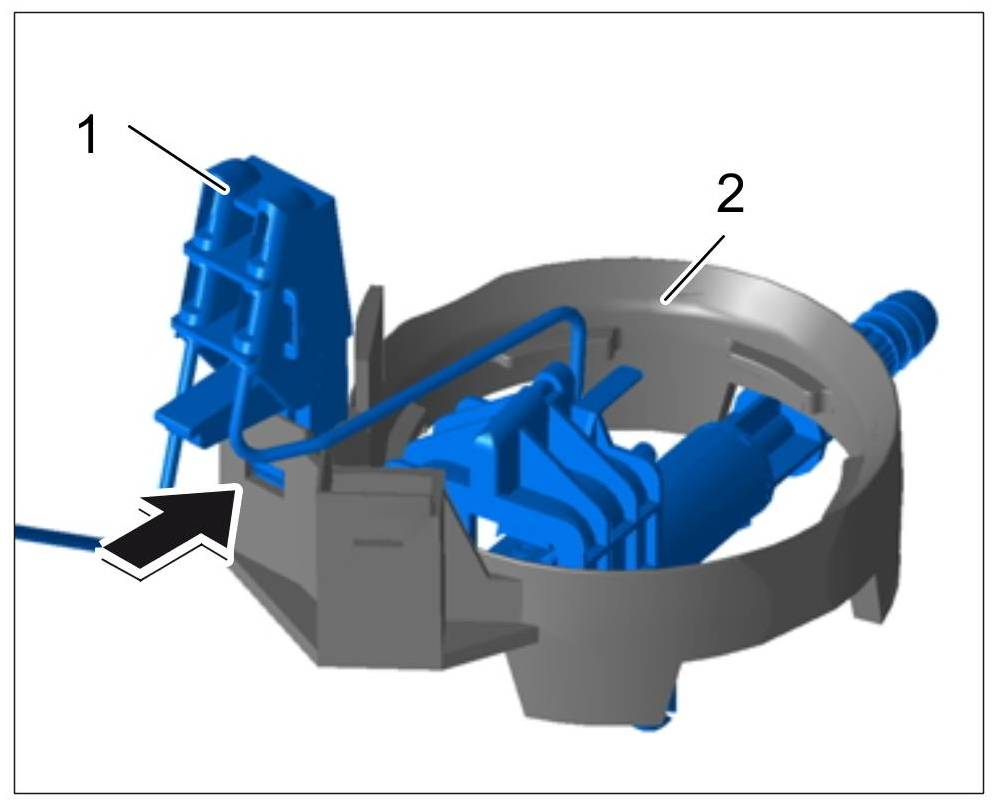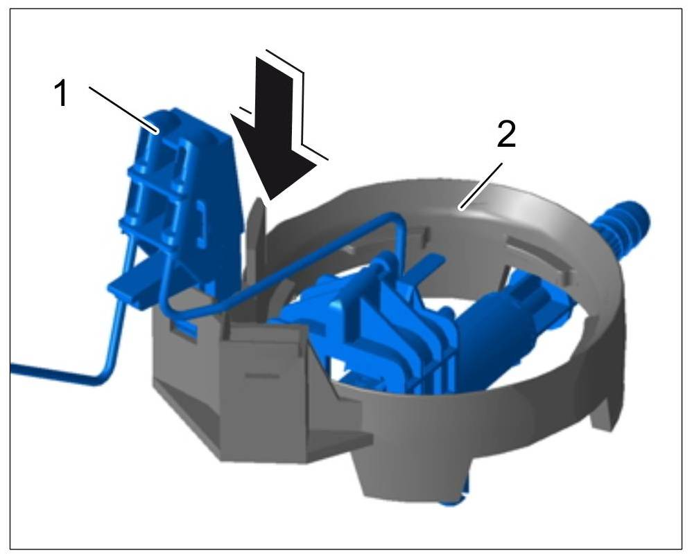 2. Position the sucking jet pump -1- in the fuel tank and clip it into the holder -2-.