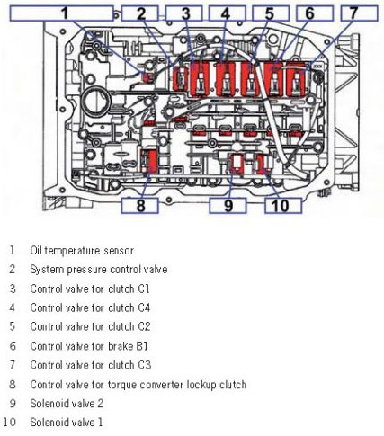 The input rpm-sensor for the transmission measures the engine speed directly at the transmission input shaft. The output rpm-sensor uses the ring gear on the rear planetary gear set. These signals are sent to the transmission control module. Upshifts and downshifts are performed, the lockup clutch is activated and the engine torque is influenced according to these signals.