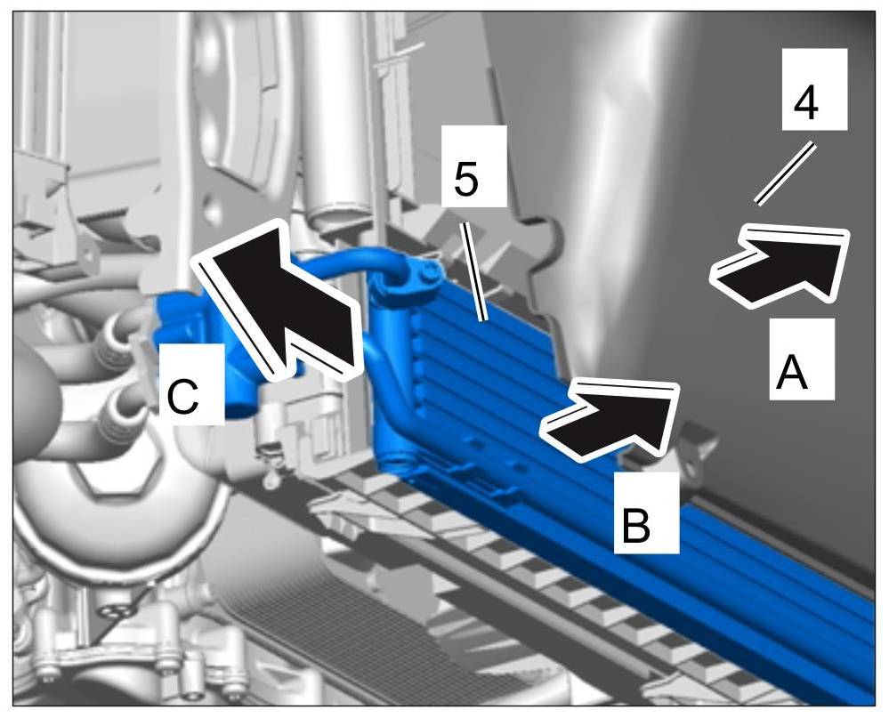 8. Pull ATF cooler -5- to the right and out -arrow C-.