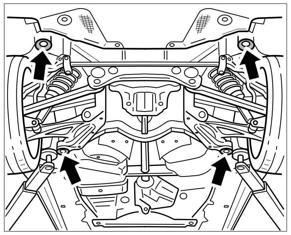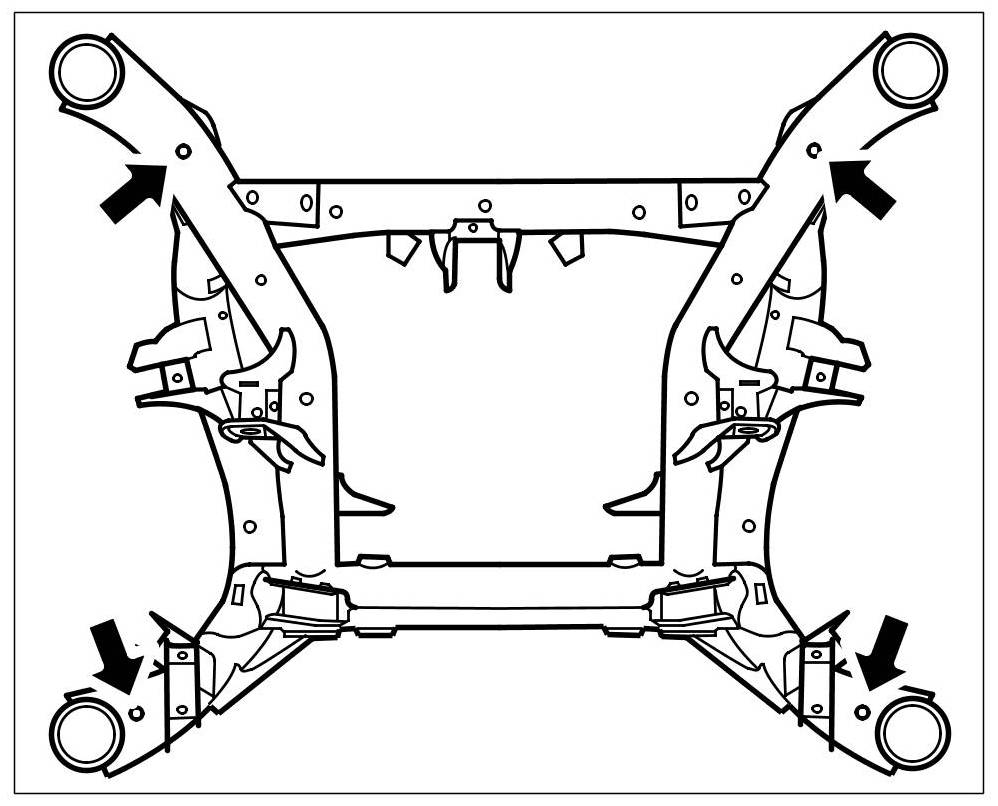 11. Unscrew four fastening screws -arrows- and lower the chassis subframe. Check that all components have sufficient clearance.