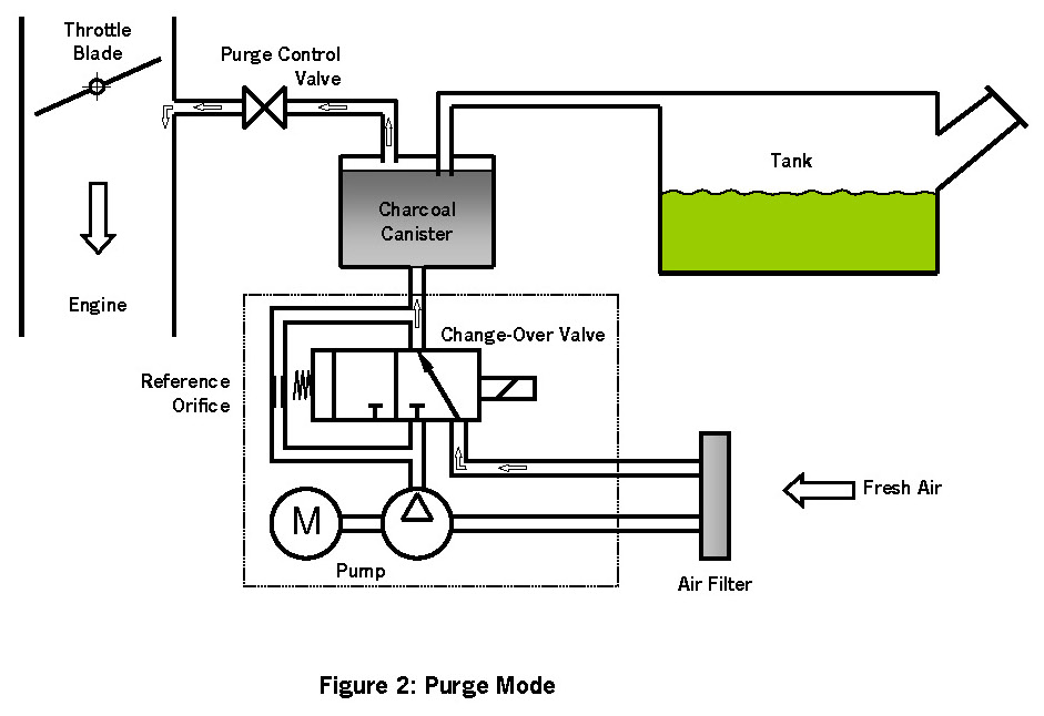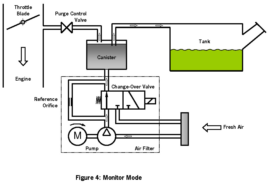 In the Monitoring Mode (Fig. 4) the change-over valve is switched on while the purge control valve remains closed. The motor current drops to a zero-load level. Fresh air is now pumped through the charcoal canister into the tank. A small overpressure, indicated by an increase in the motor current, builds up if the evaporative system is tight.