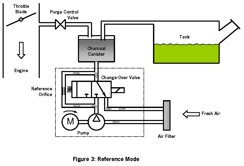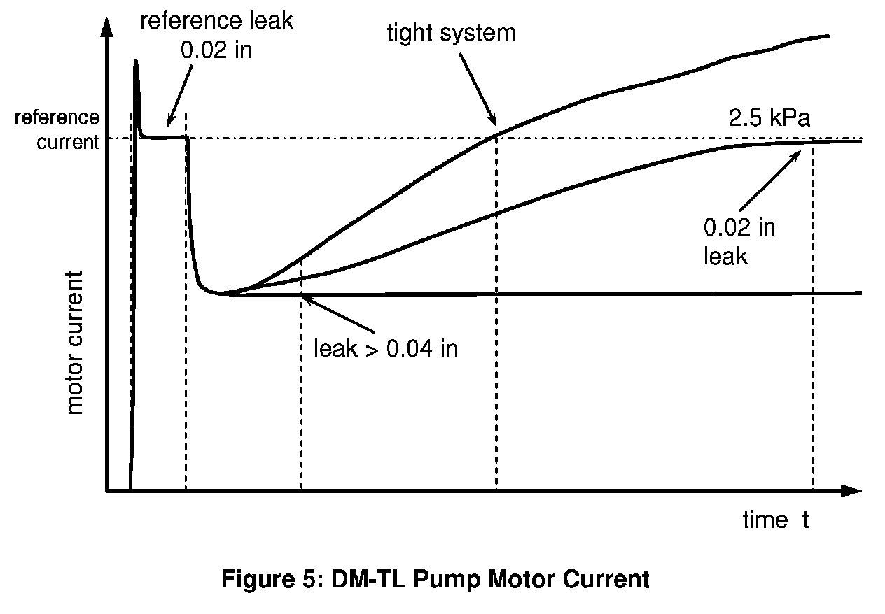 The DM-TL (Diagnostic Module Tank Leakage) is used for monitoring the evaporative system for small (> 0.02 in) and rough (> 0.04 in) leaks. It consists of an electrically driven air pump, a change-over valve and a 0.02 inch orifice for reference measurement - see Fig. 1. The tightness of the tank system is obtained by comparing the actual air pump's motor current with that measured when the system is operated with a standardized reference orifice.