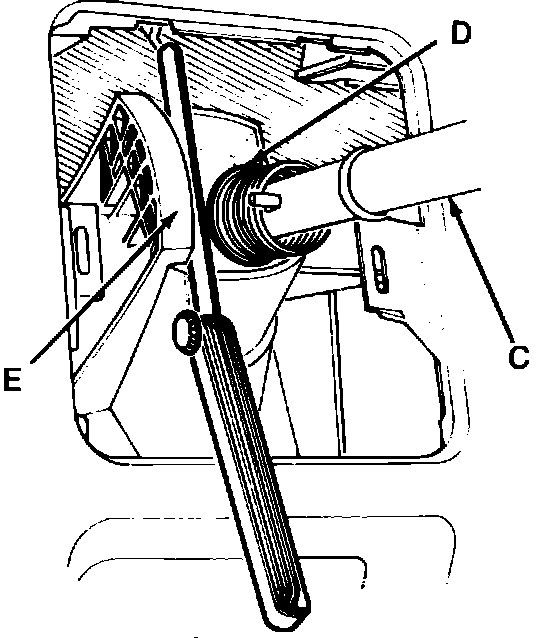 4. Move gearshift lever (C) toward passenger side of vehicle and insert a .0197 in. feeler gauge between reverse stop release holder (D) and the gearshift lever housing (E), Fig. 4.