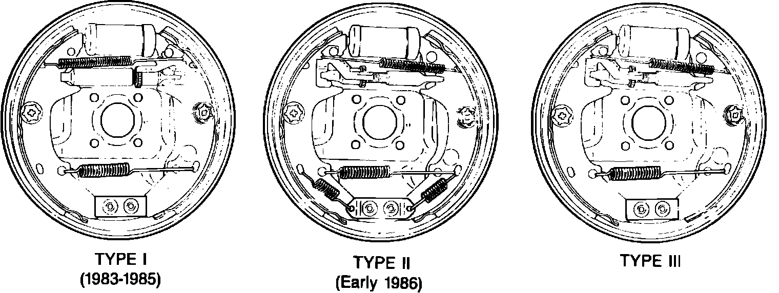 Three different rear brake shoes are used, Fig. 4, referred to as Type I, Type II and Type III. Brake shoes and wheel cylinders are common to all three types. However, backing plates, springs, adjusters and mounting hardware are different. When servicing these assemblies, do not install two different type assemblies on the same axle.