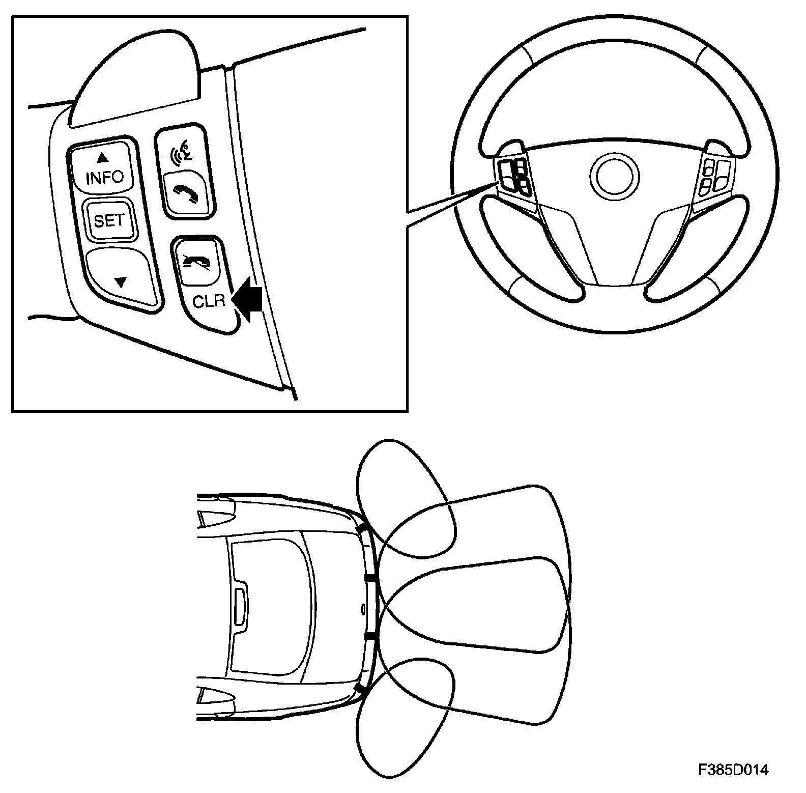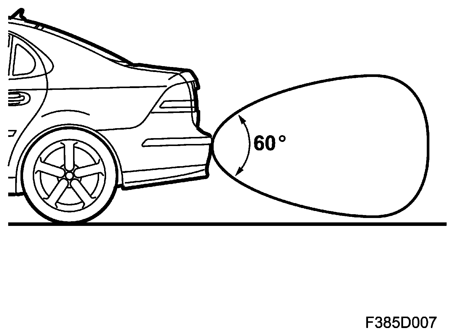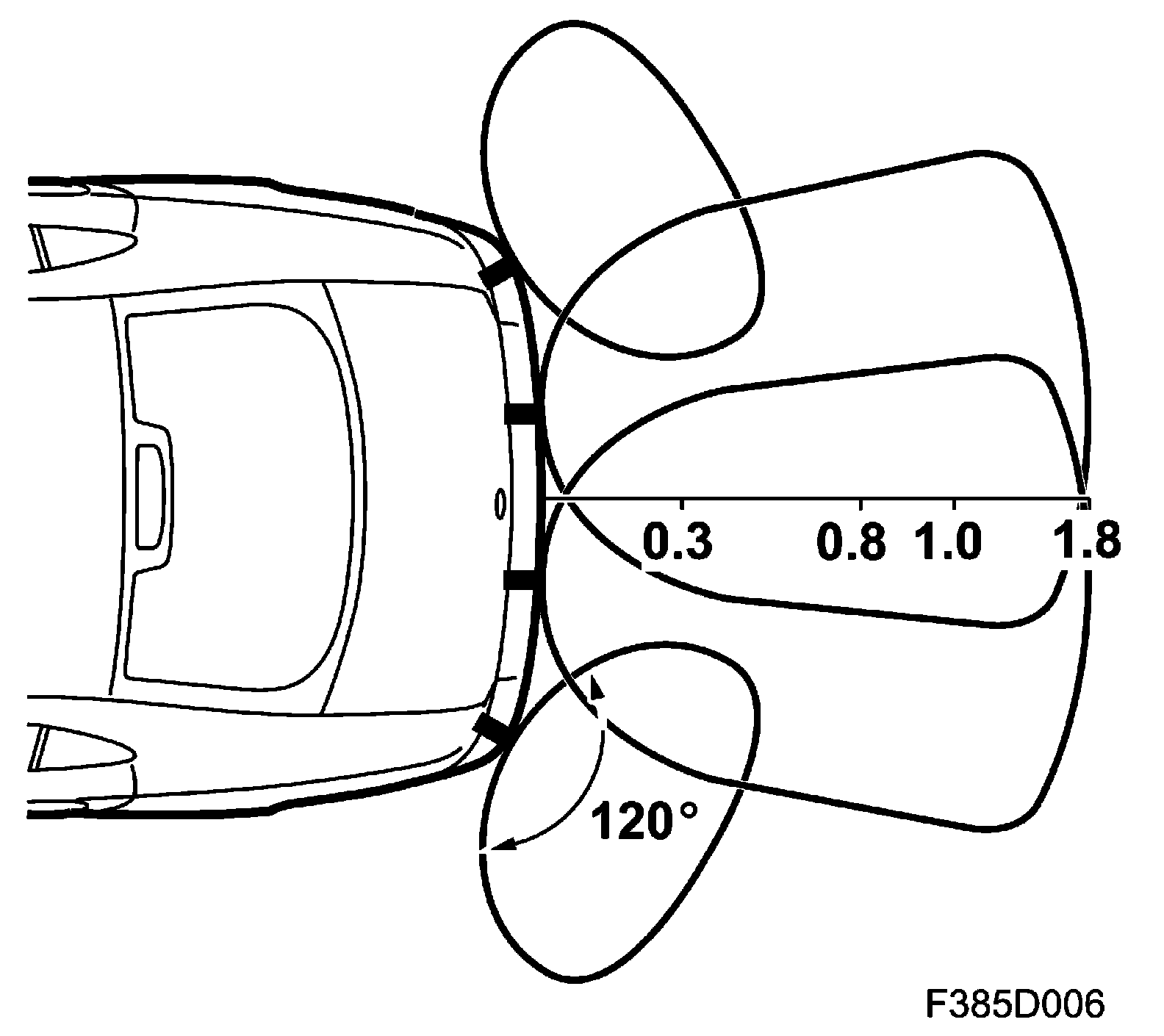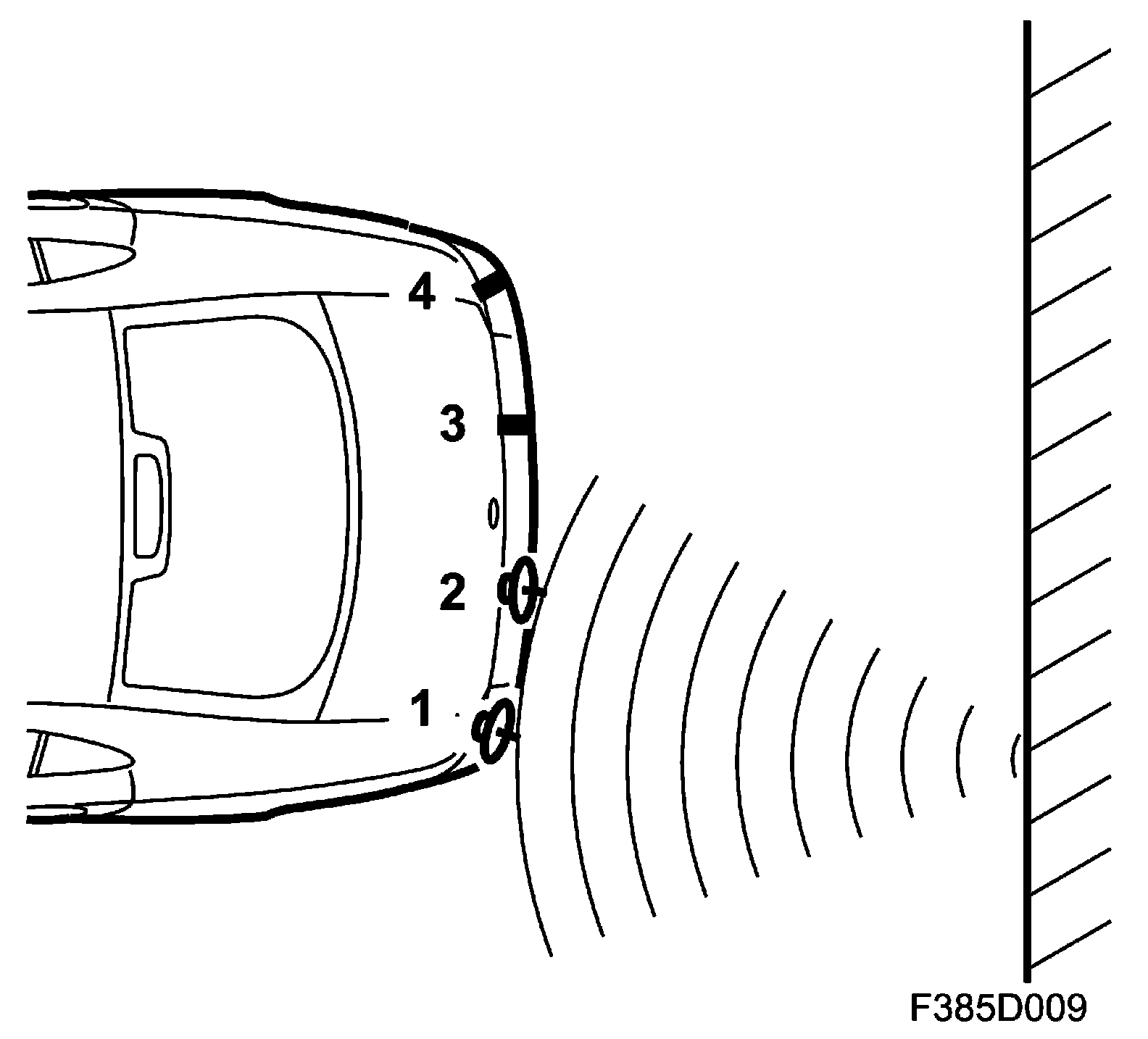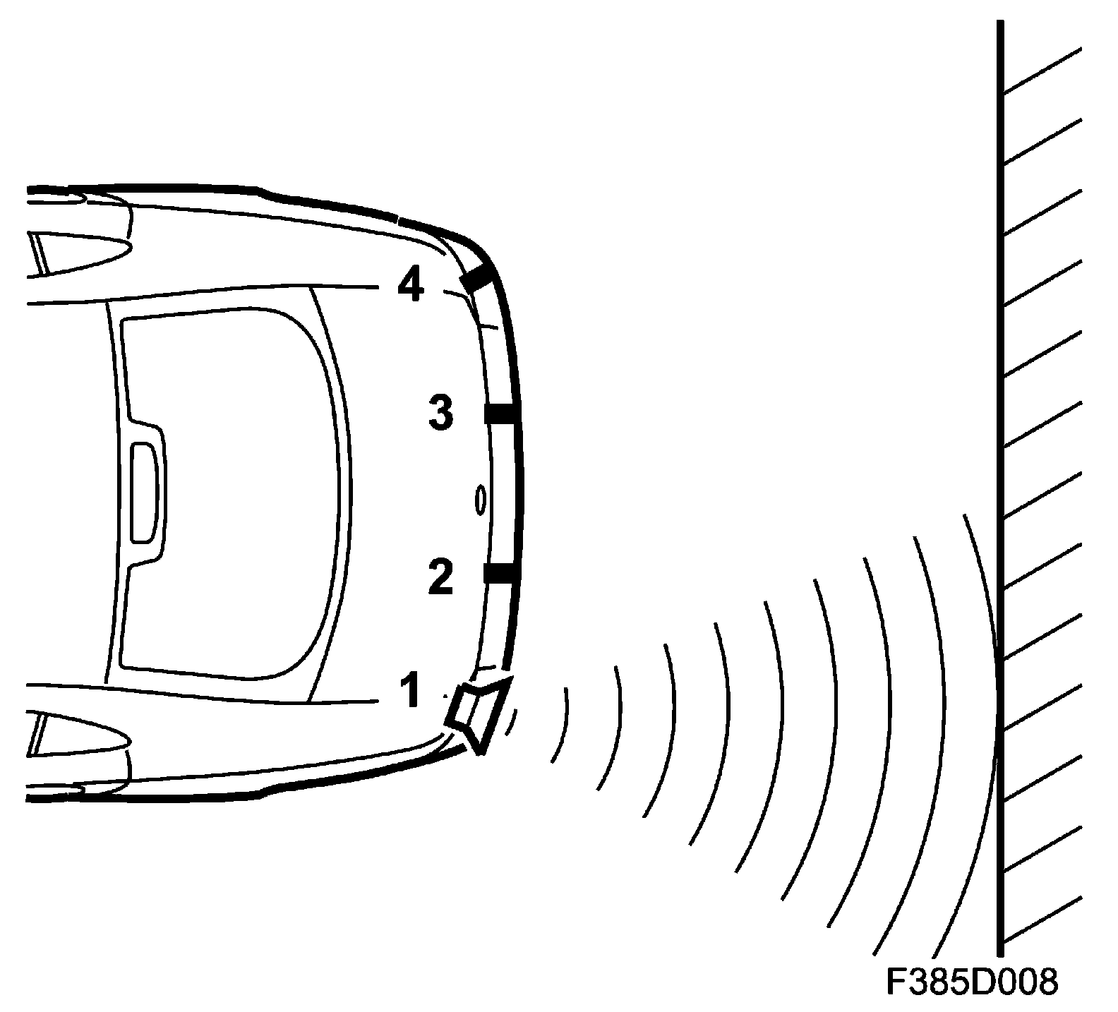 The control module receives information from the underhood electrical center, UEC (manual transmission) or TCM (automatic transmission) via a bus message when reverse gear is selected, and the control module then activates the distance sensors. These sensors begin to transmit and receive audible signals according to a loop controlled by the control module which is repeated 3 times a second.