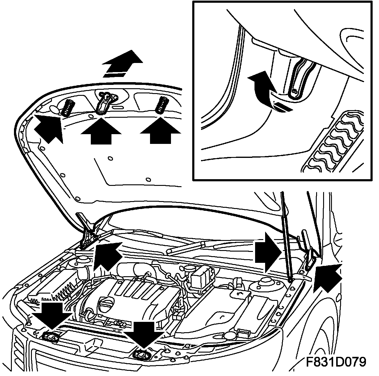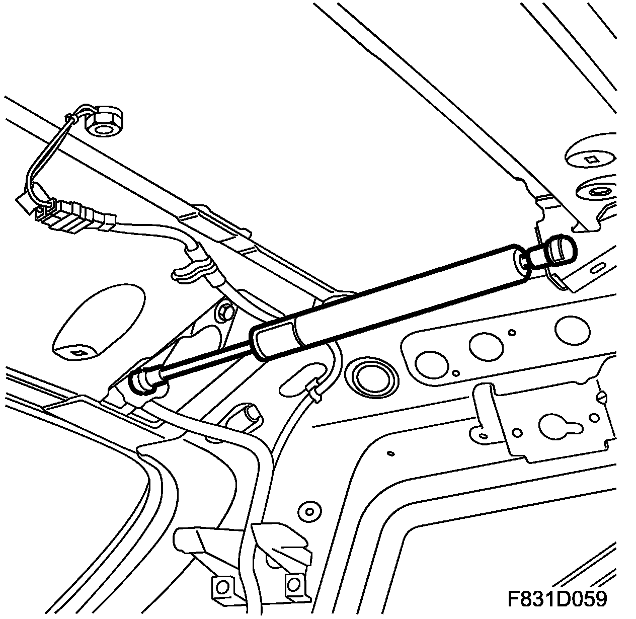 The bonnet is equipped with a gas lifting spring that holds it open. The gas spring is located on the left-hand side of the front wing with anchor points on ball studs in the body and bonnet.