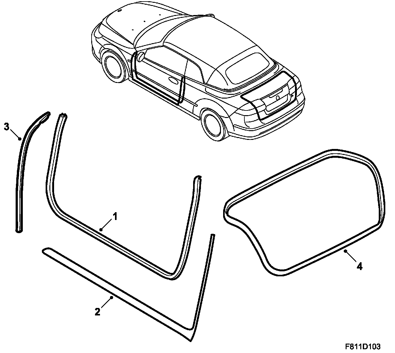 The front edge of the door seal (3) forms a seal between the front edge of the door and the wing. The seal is fastened to the door's metal flange.