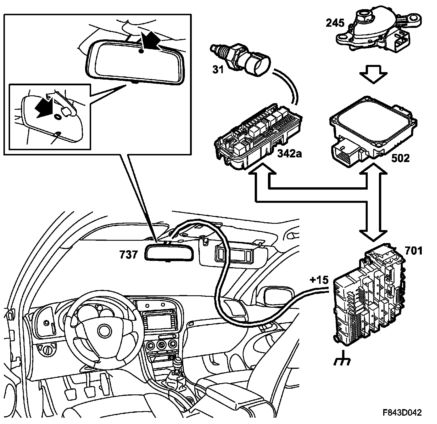 Current (+15) is fed from the REC via fuse 5 to the rearview mirror. The mirror is grounded via the REC to grounding point G3.