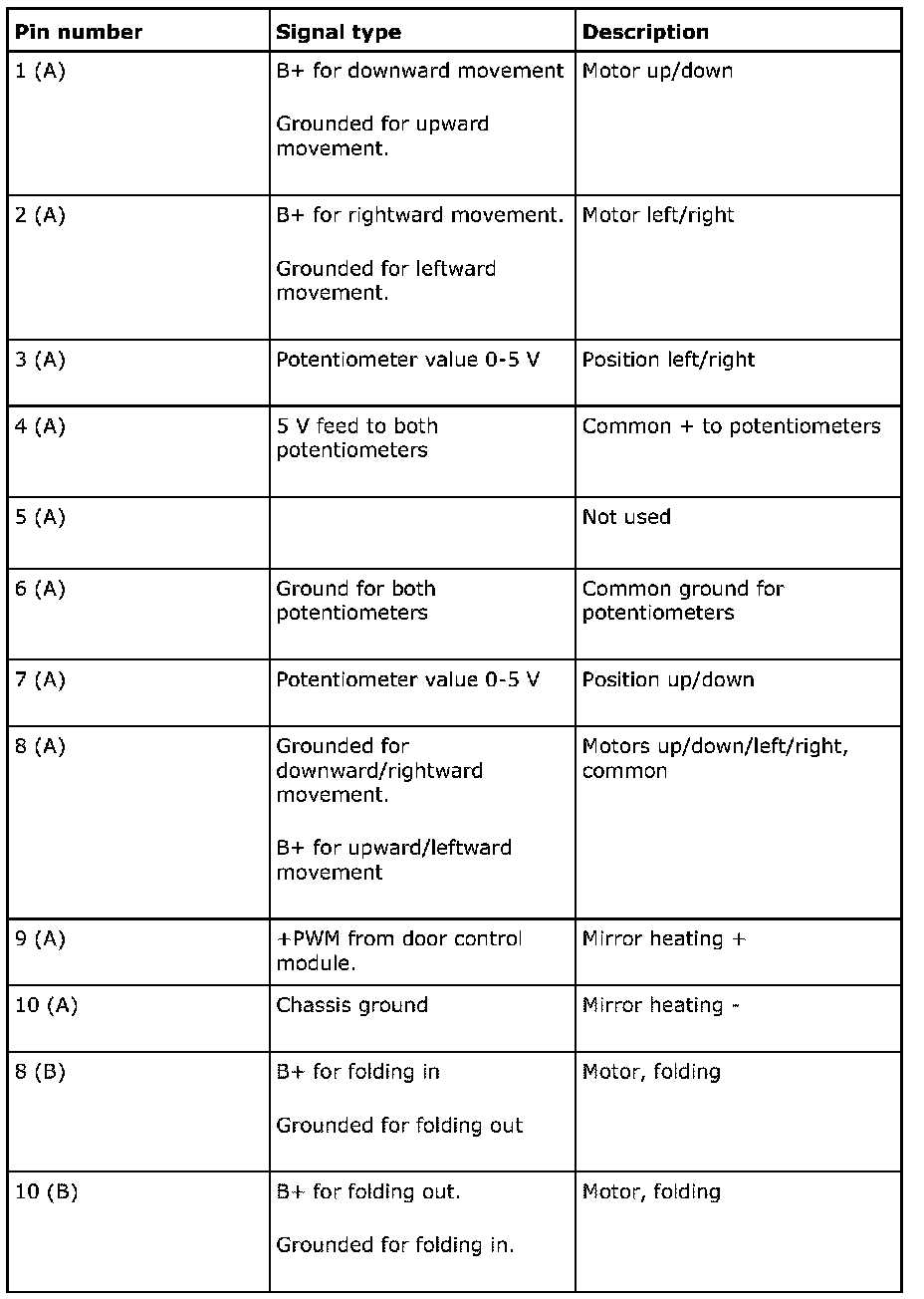 The door mirror has one motor for angling the mirror glass to the left and right and one for angling it up and down. Both motors are 2-pole motors. Their polarity is reversed to run them in the opposite direction. The motors of mirrors with memory function each have a potentiometer. Electrically foldable mirrors have an additional motor. This is also a 2-pole motor, the polarity of which is reversed to run it in the opposite direction.