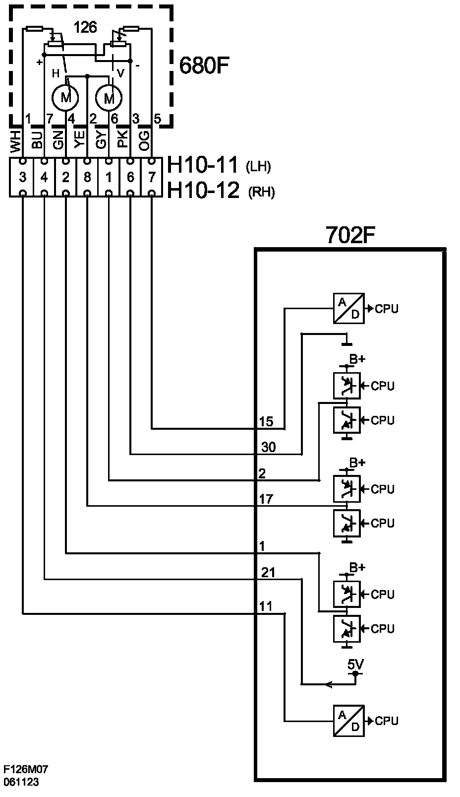 The sensors are connected by 4 wires to the door control module. The sensors have a common 5 V power supply and ground. They each have a signal cable to the door control module. The voltage from each potentiometer is converted into a digital value. The control module input has a high-ohmic resistor connected to 5 V. The purpose of this voltage is to ensure that the voltage on the pin goes to 5 V in the event of a power loss, so that a DTC can be generated.