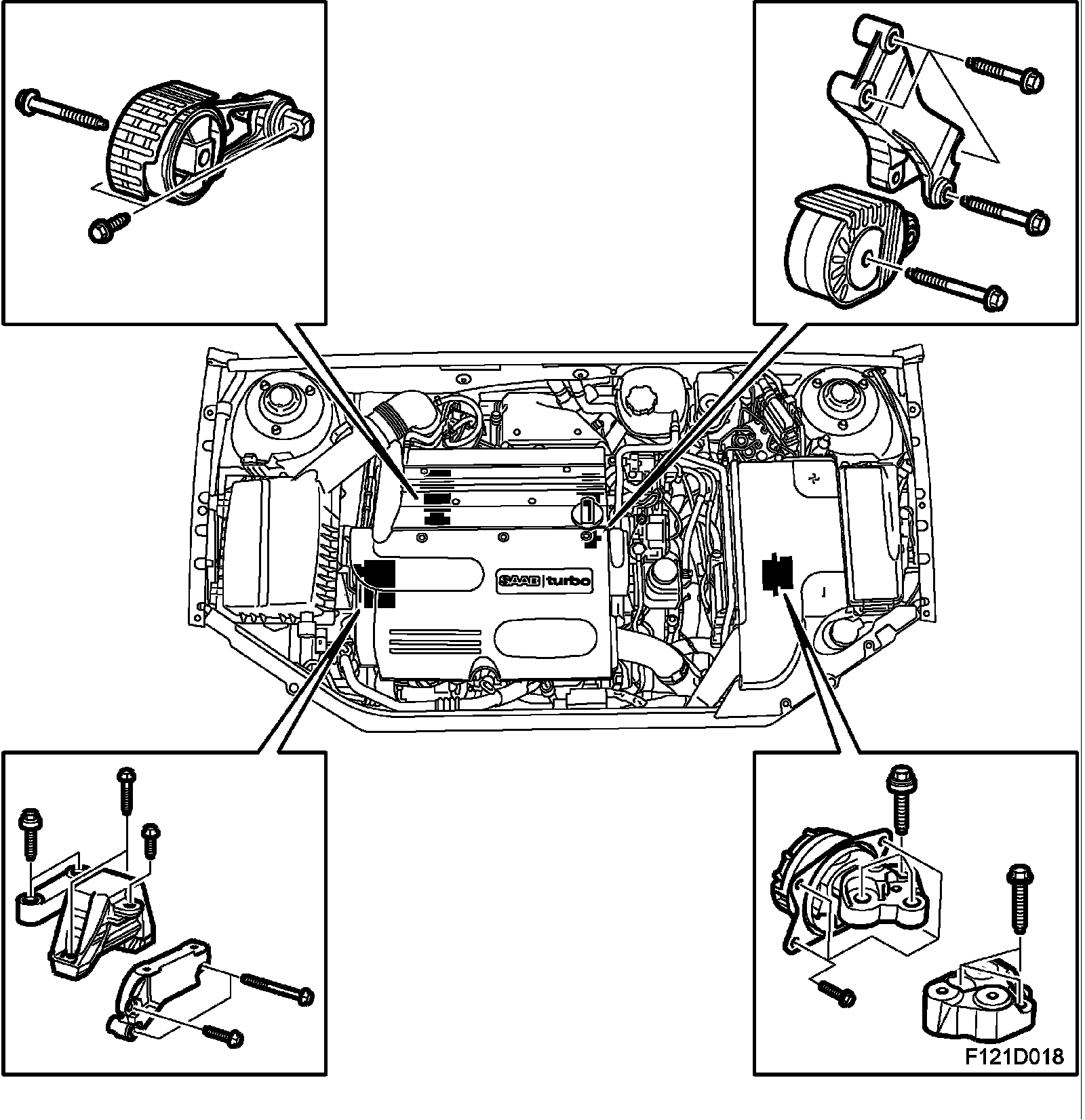 The left-hand one is rubber, while the right-hand one is a combined rubber/hydraulic design. Using a hydraulic mounting on the right-hand side reduces the vibration that arises in the drive unit due to poor road surfaces. The vibration inherent in the engine is absorbed by the rubber part of the mounting, while the hydraulic part is active when the amplitude (vibration) in the drive unit is greater. Two torque arms complete the engine suspension. These arms, one fastened to the oil pan and helper frame, and the other to the mating surface between the engine and gearbox and the helper frame, absorb the torque that is exerted on the drive unit during acceleration and retardation.