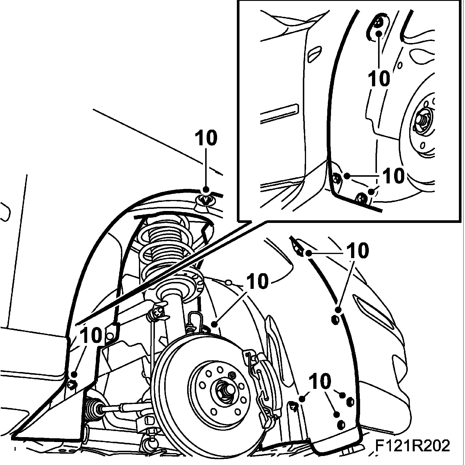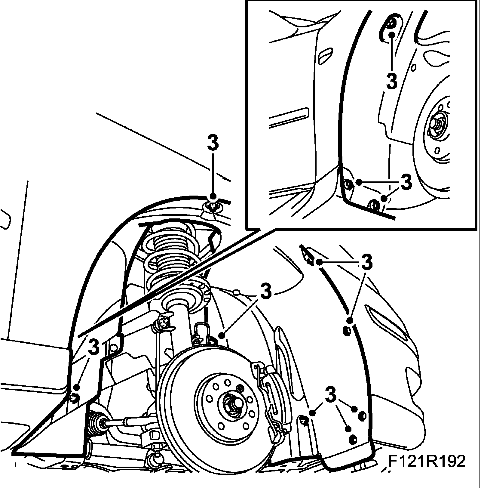 3. Remove the right wing liner and raise the car further. CV: Remove Chassis reinforcement, front supporting frame, CV