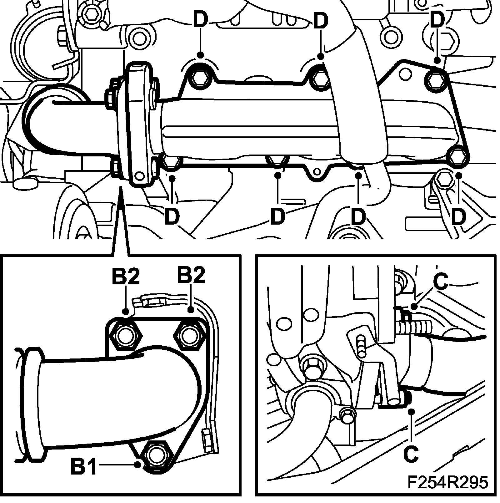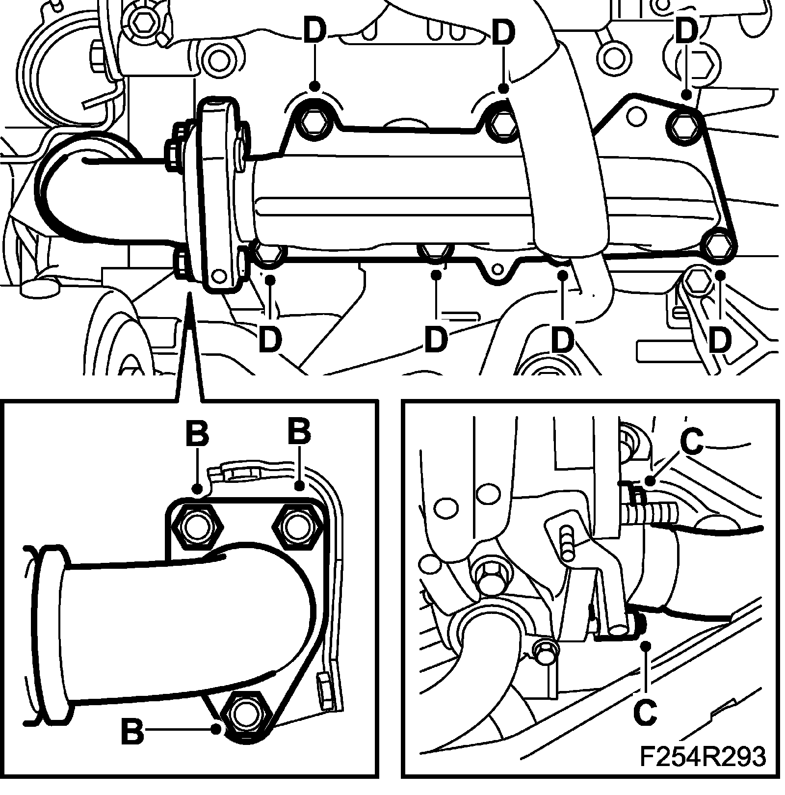 3. Fit the exhaust manifold (D) using new bolts and a new gasket.