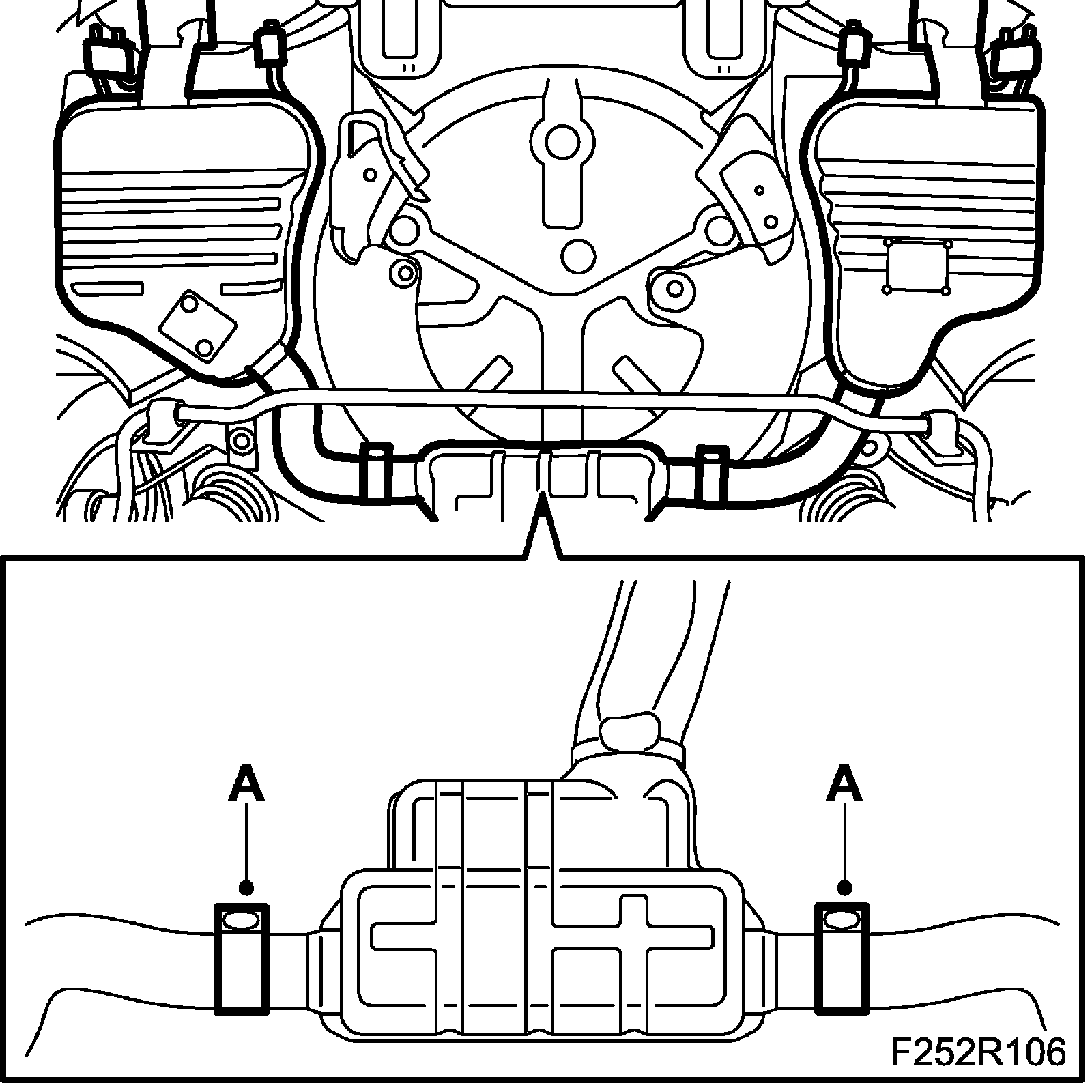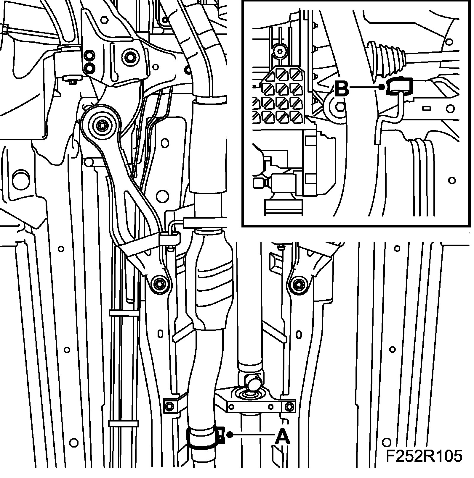 1. Fit the center rear silence to the rear catalytic converter (A) and fit the bracket (B).