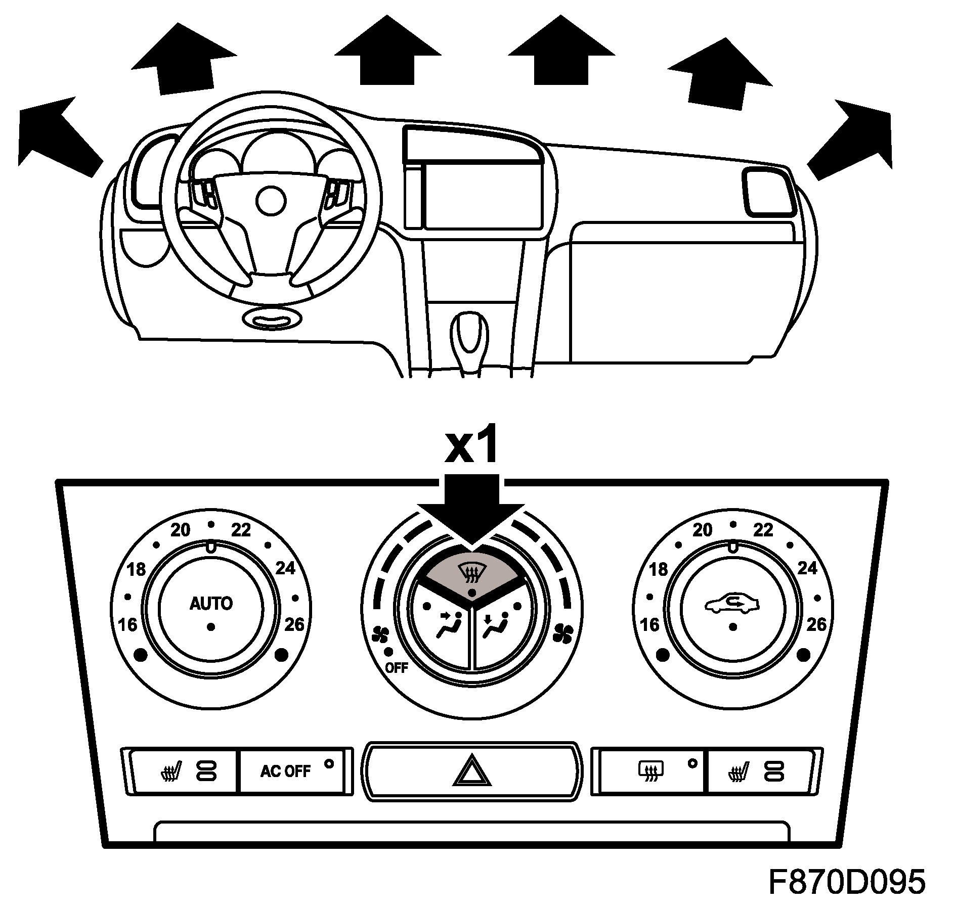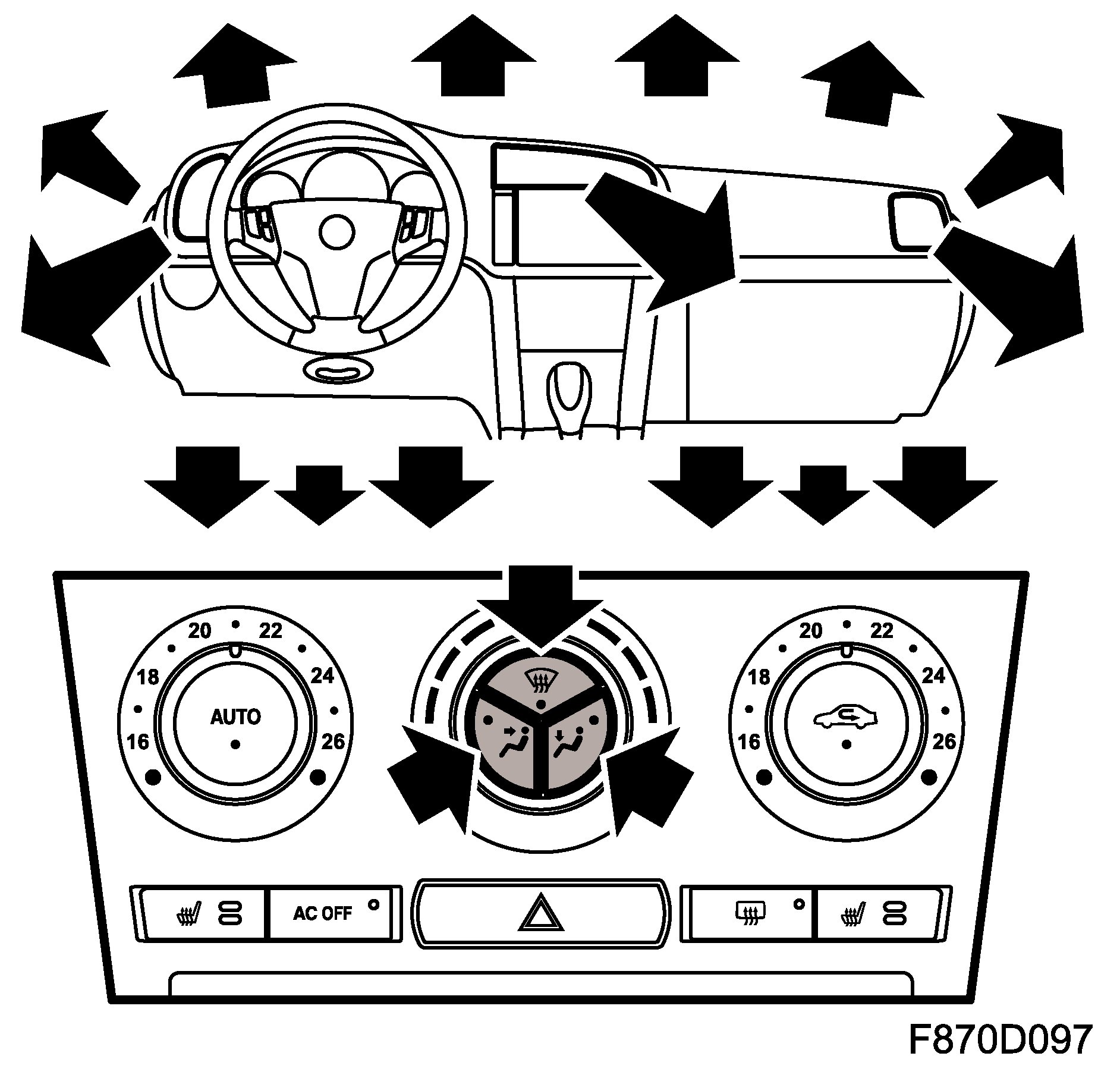 When the driver zone requires warmth, defrost+floor is selected; when cooling is required, the panel damper is also opened. If rapid cooling is required, the air distributed to the defroster is reduced, and if necessary also the air to the floor vents, increasing the flow of air through the panel vents. When the car is started in cold weather, defrost only is selected initially. Once the coolant has reached a temperature of 35 degrees C, the floor damper will start to open. At 45 degrees C, the floor damper opens more rapidly and the defroster damper is closed slightly to distribute more air to the foot wells.