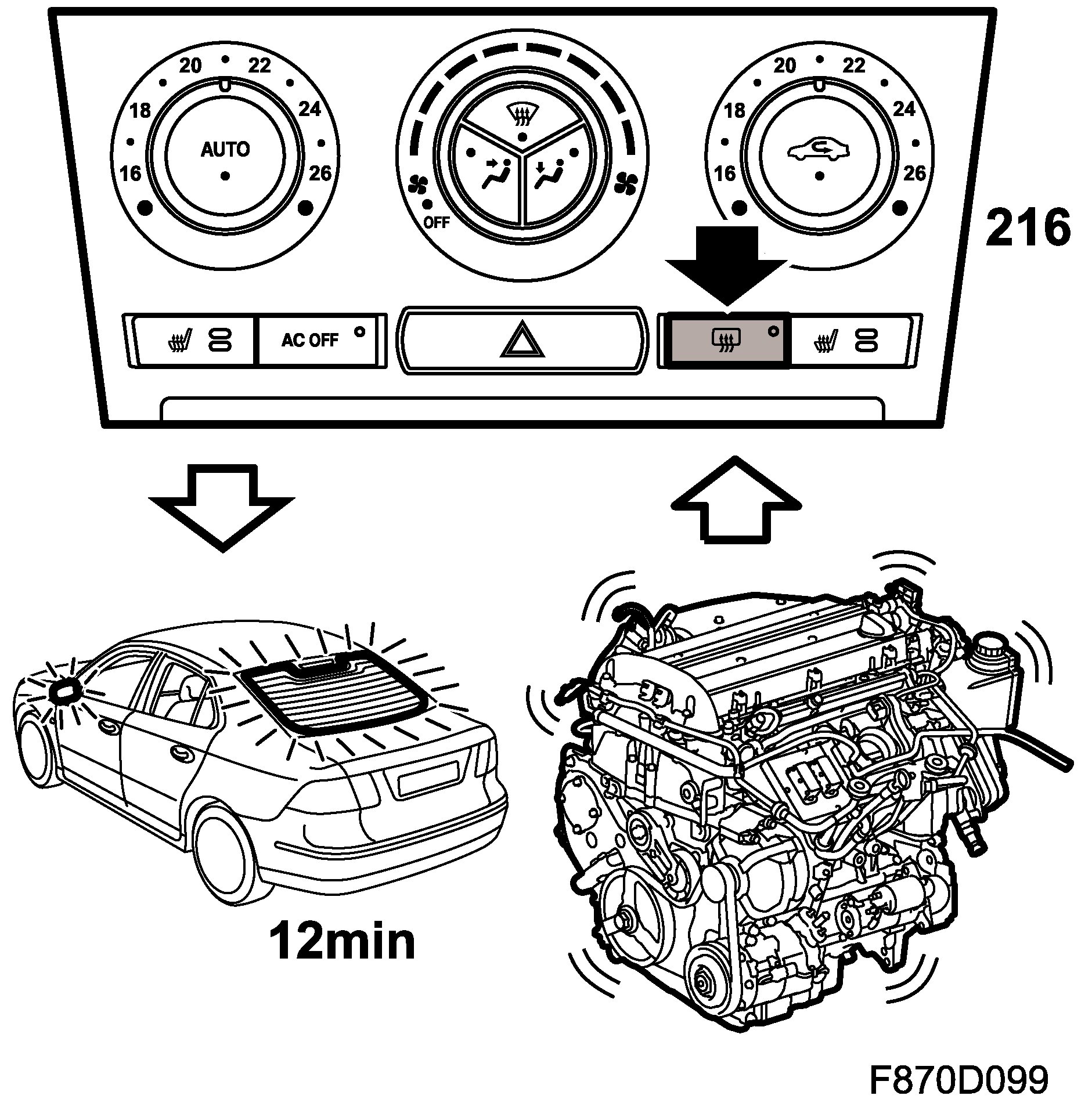 If the engine is still, no coolant is circulated through the heat exchanger, the A/C compressor is still and the generator does not charge. This means that the system cannot regulate the climate, the system should not use current unnecessarily and there is a risk that a stepping motor cold miss a step due to low battery voltage if the starter motor is not activated. For these reasons, the control module sets rear window defrost off, seat heating off, fan current 0 A and recirculation off. It also stops all stepping motors (manual adjustment is possible).