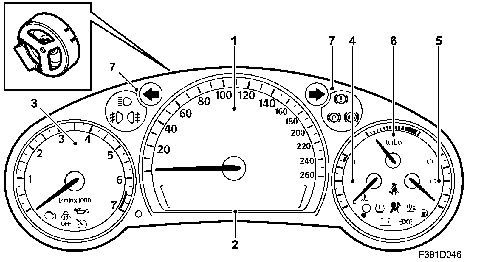 When the ignition is turned ON, the instrument will perform a lamp check and turn on the display under the speedometer. It will also light up the graduations if the cabin lighting is dim and the needles will rise from their rest positions.