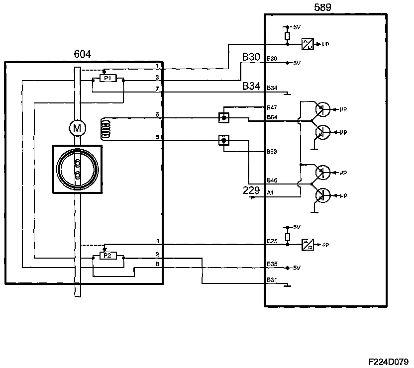 The voltage from potentiometer 1 is connected to ECM pin 28(B) and increases as the throttle opens (increased area). The voltage from potentiometer 2 is connected to ECM pin 25(B) and drops as the throttle opens (increased area). The sum of the two voltages is therefore always 5V.