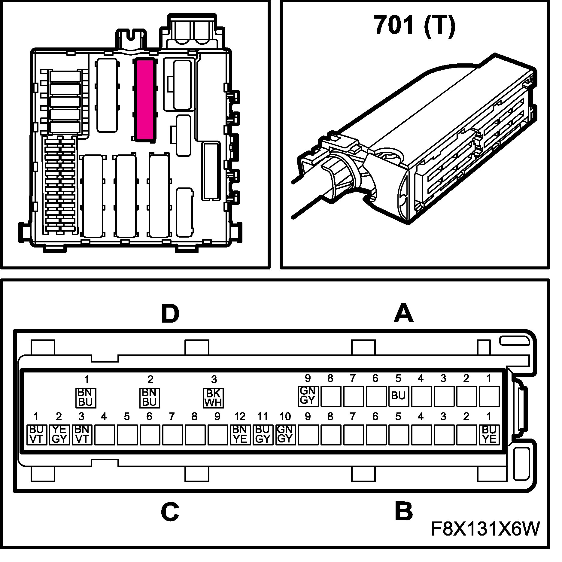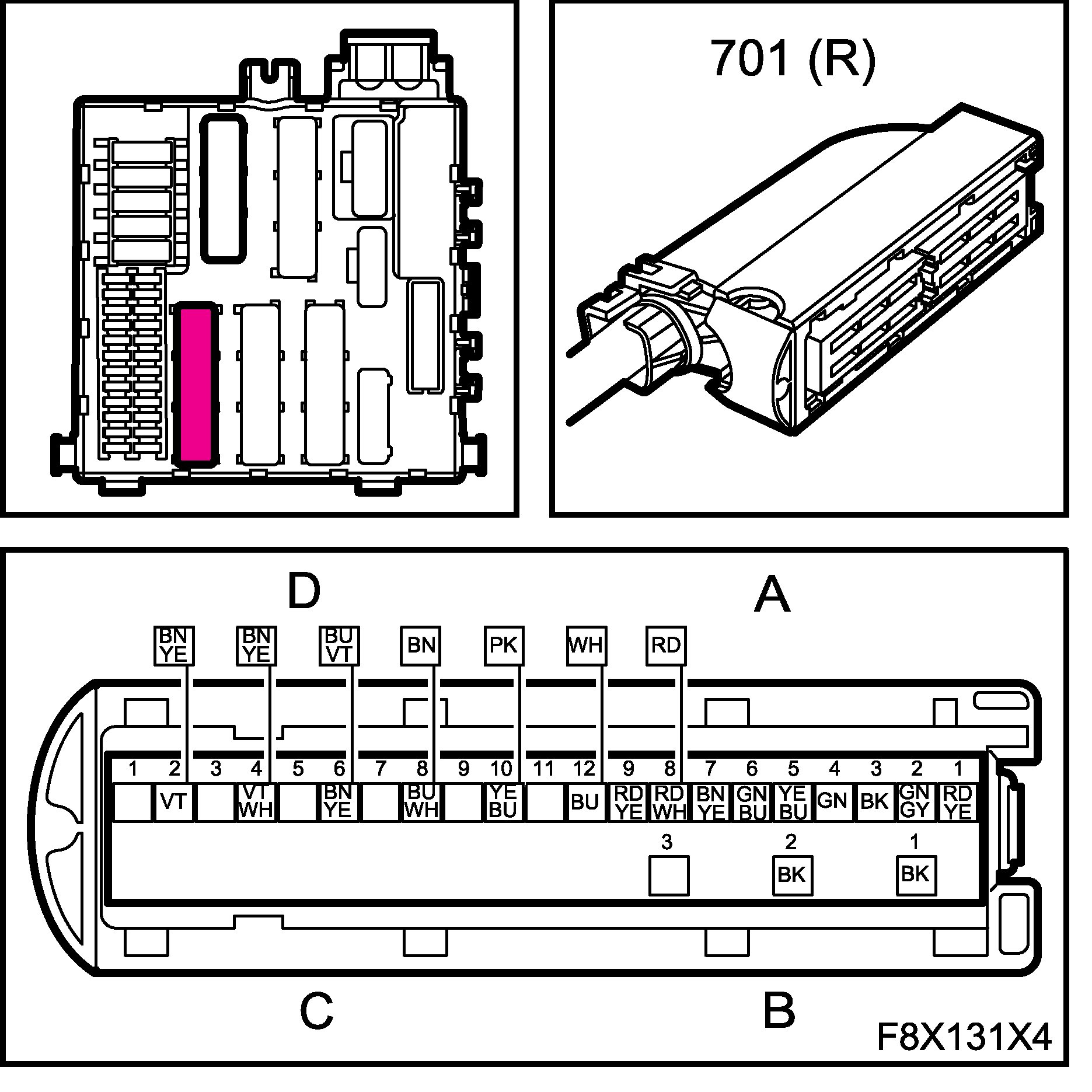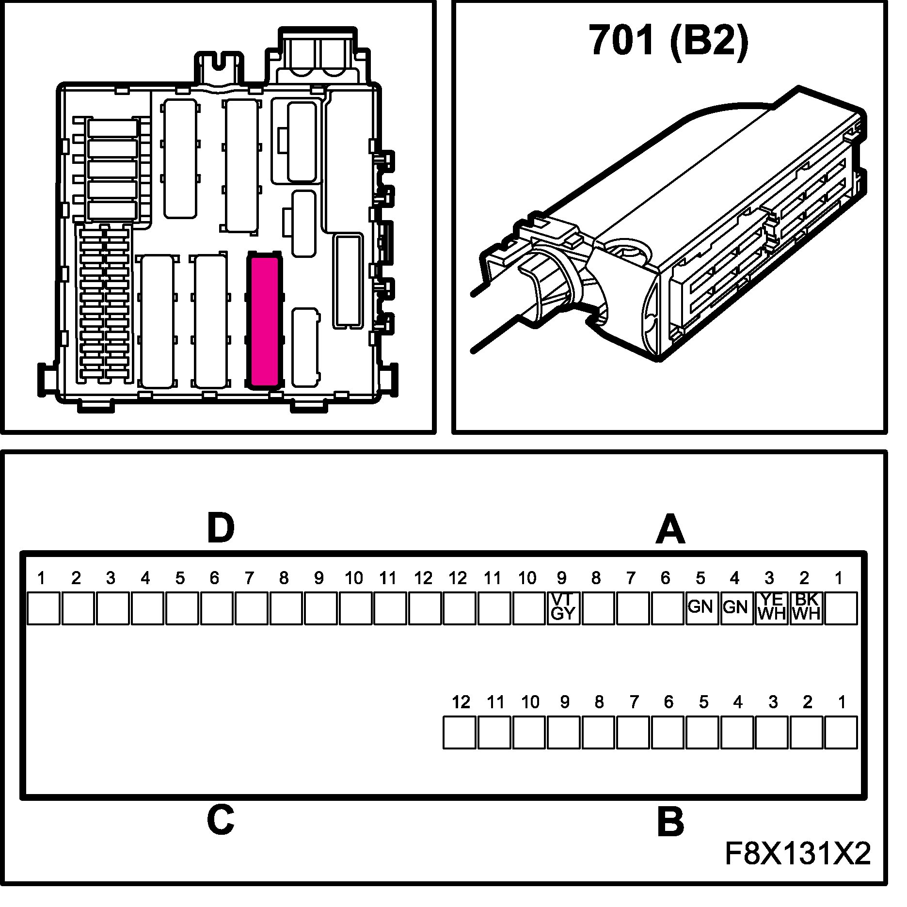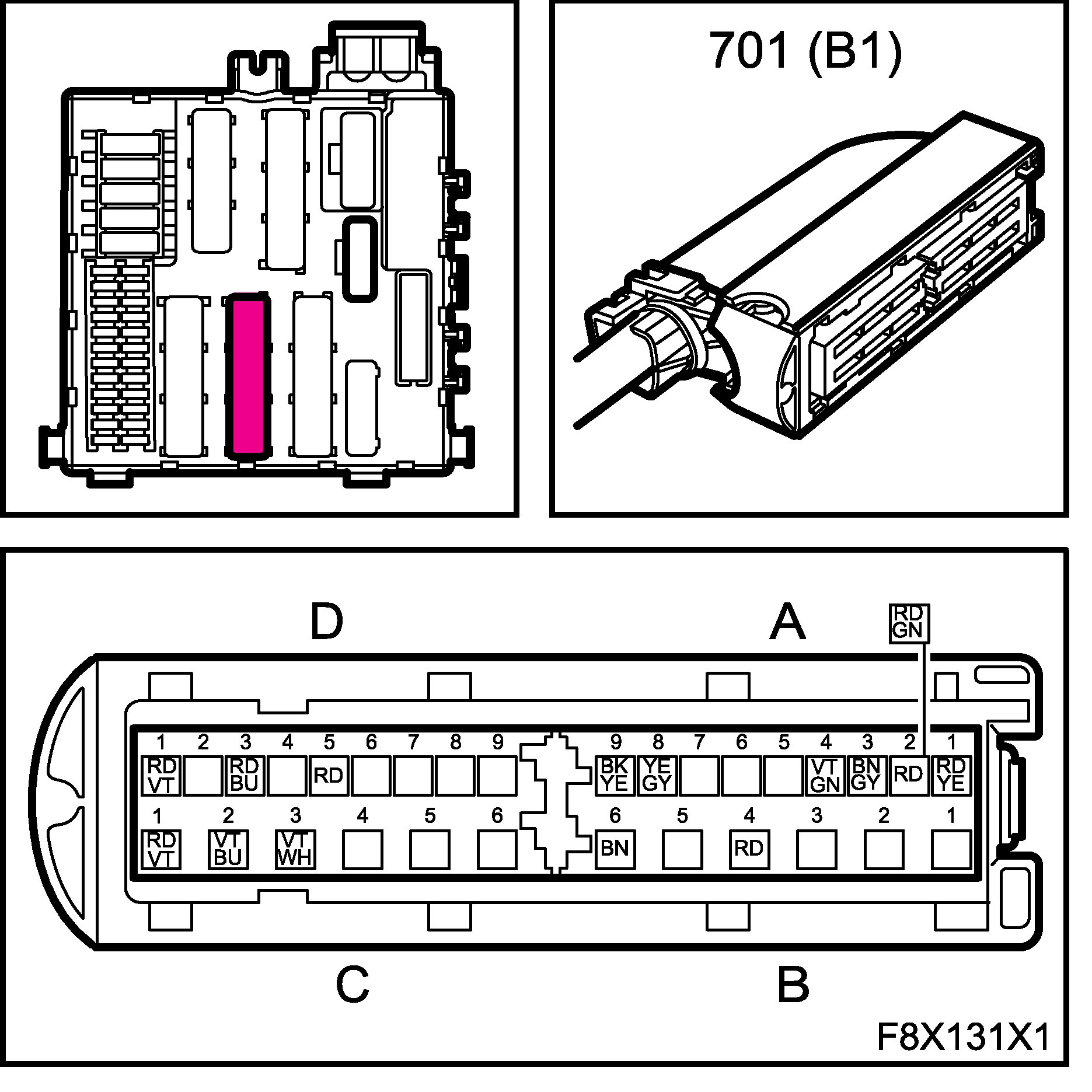 The connectors for the main and rear wiring harnesses each comprise four subconnectors, which are named A, B, C and D in the wiring diagrams, for example B1-B.