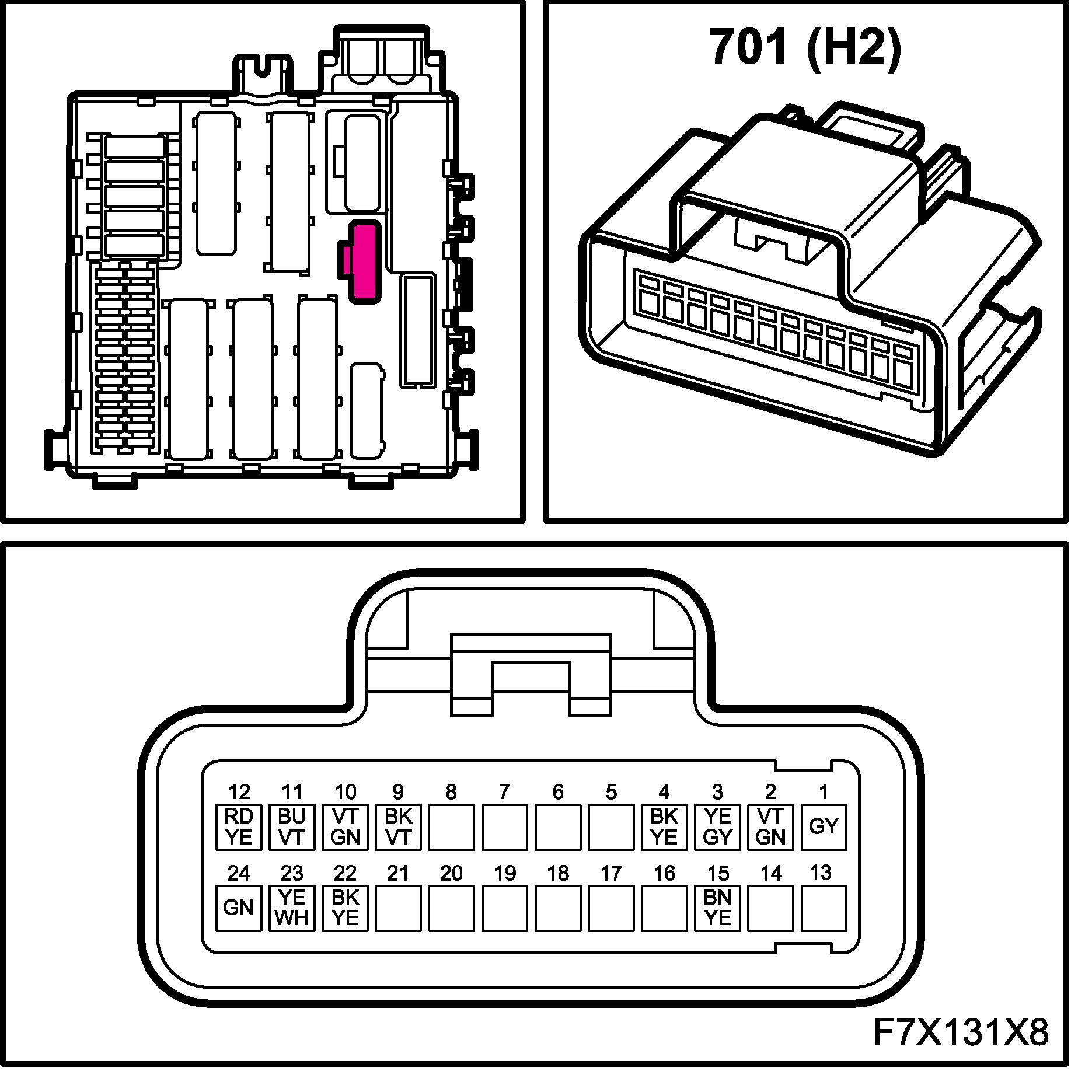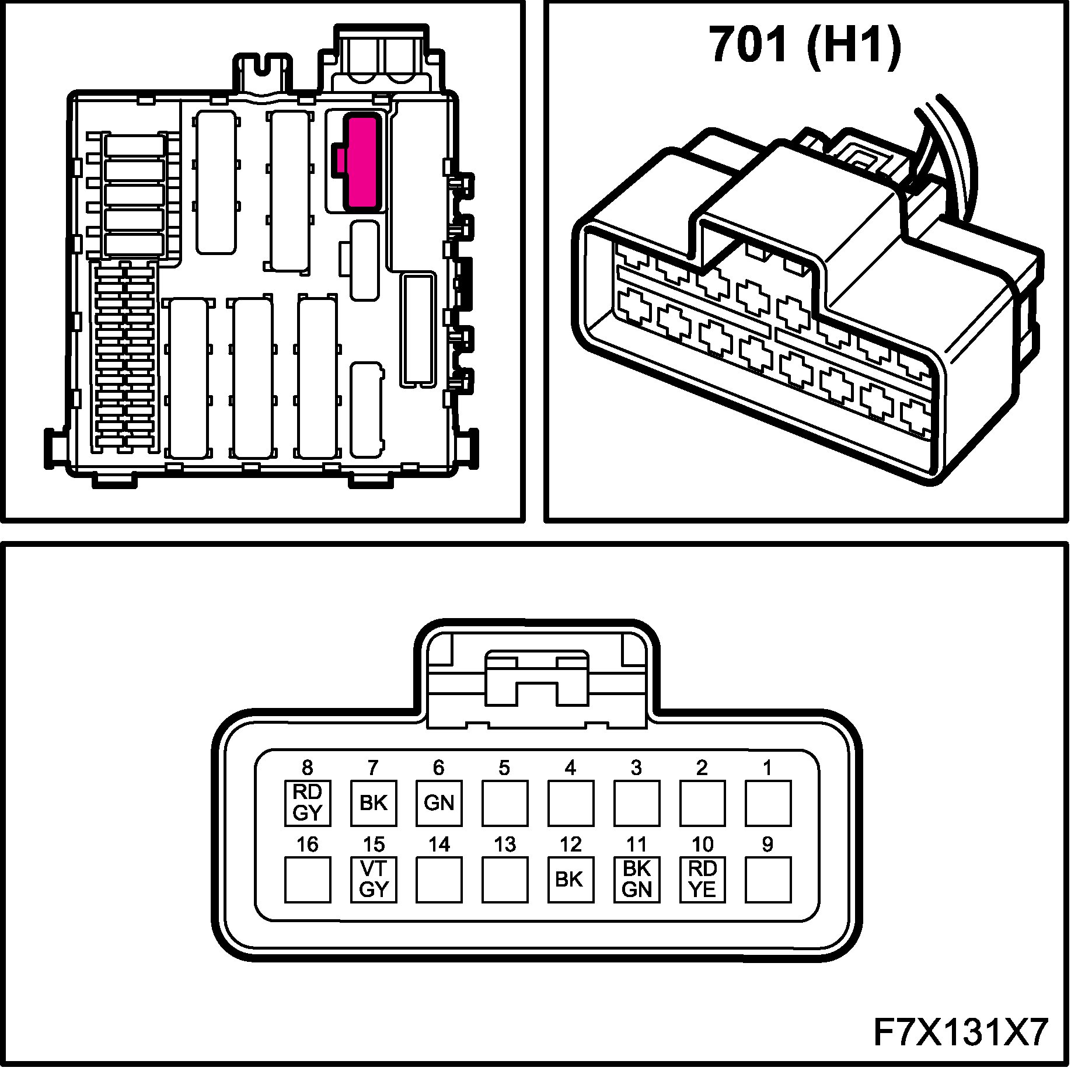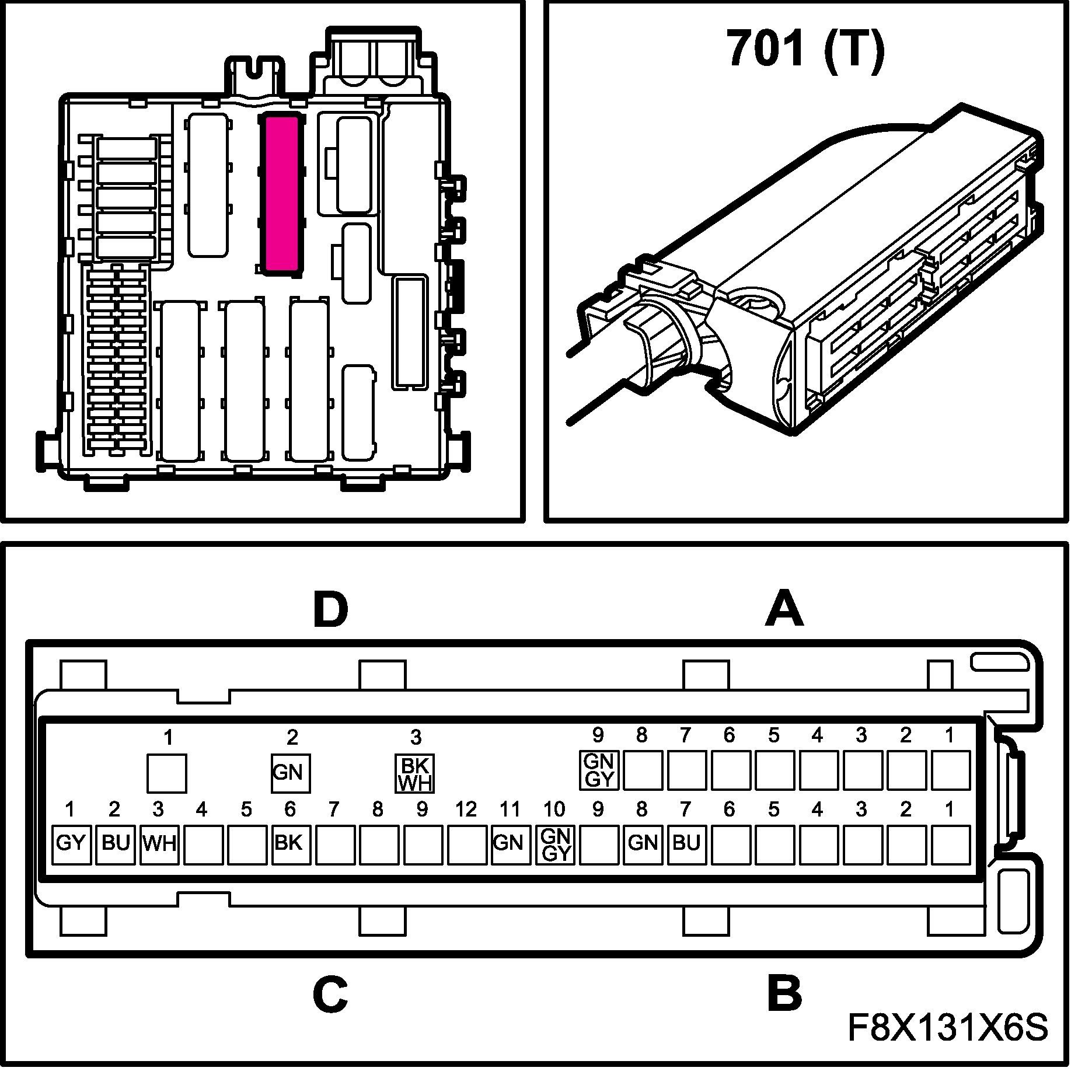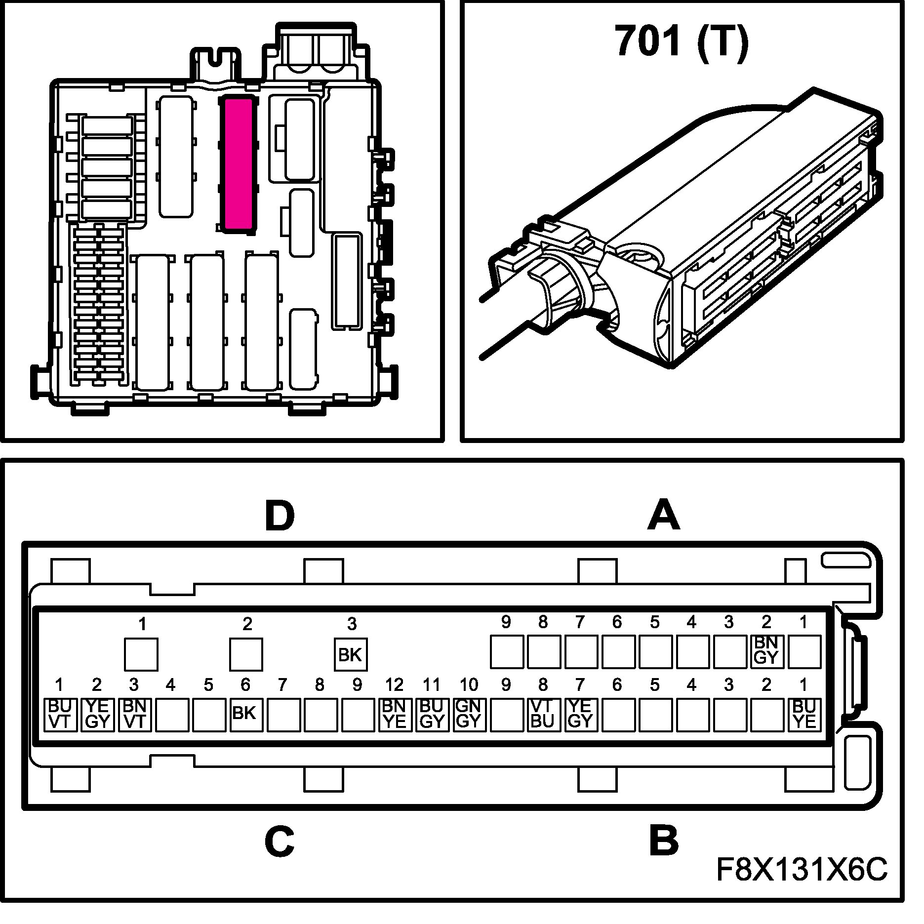 The connectors for the main and rear wiring harnesses each comprise four subconnectors, which are named A, B, C and D in the wiring diagrams, for example B1-B.