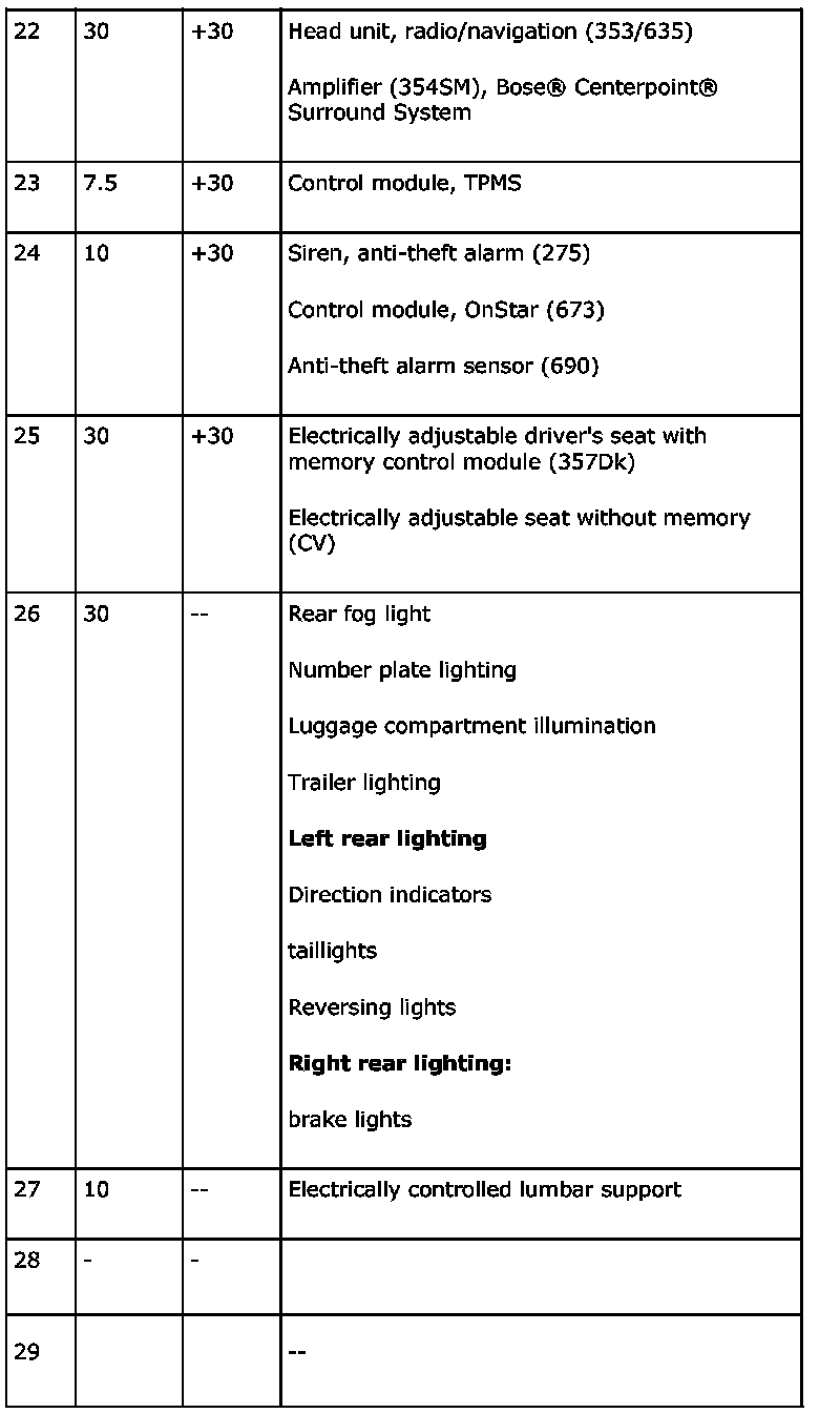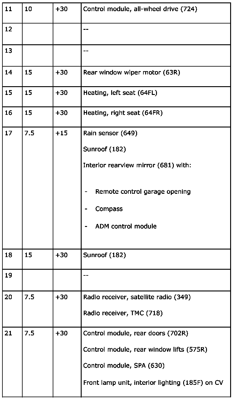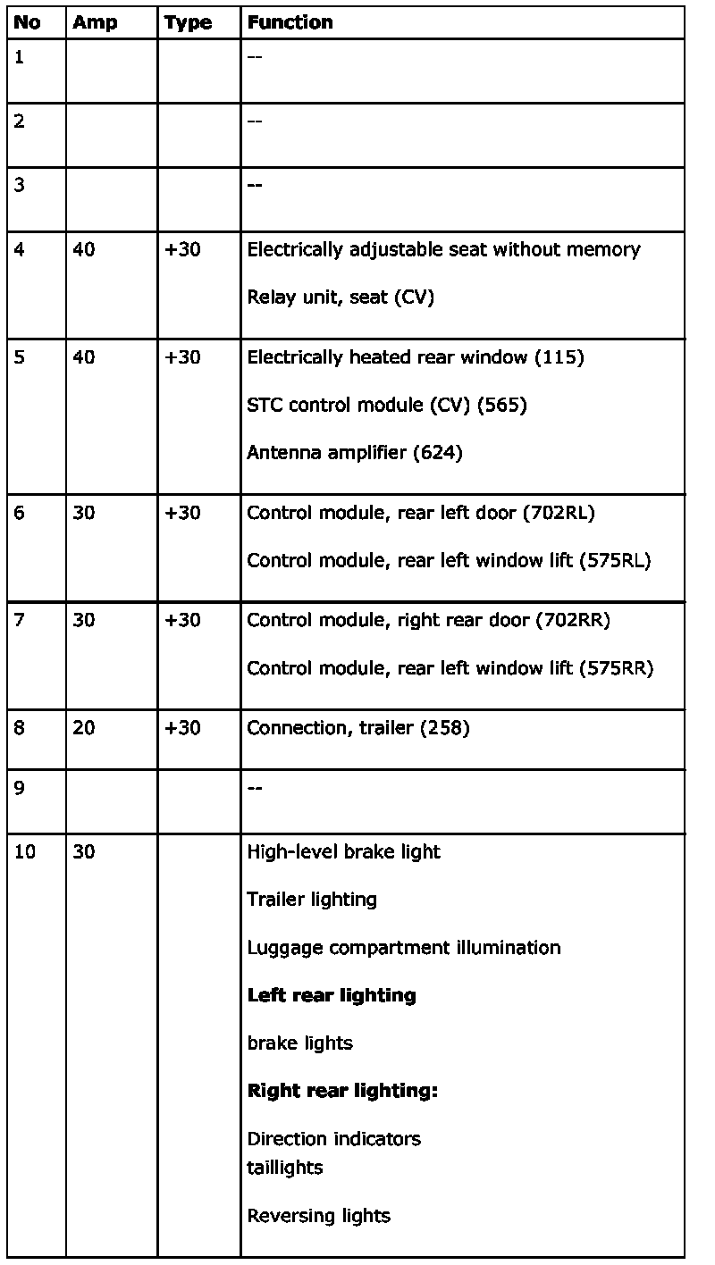 The electrical centre can contain a greater number of fuses than those listed below. In such cases, these are not connected to a wiring harness.